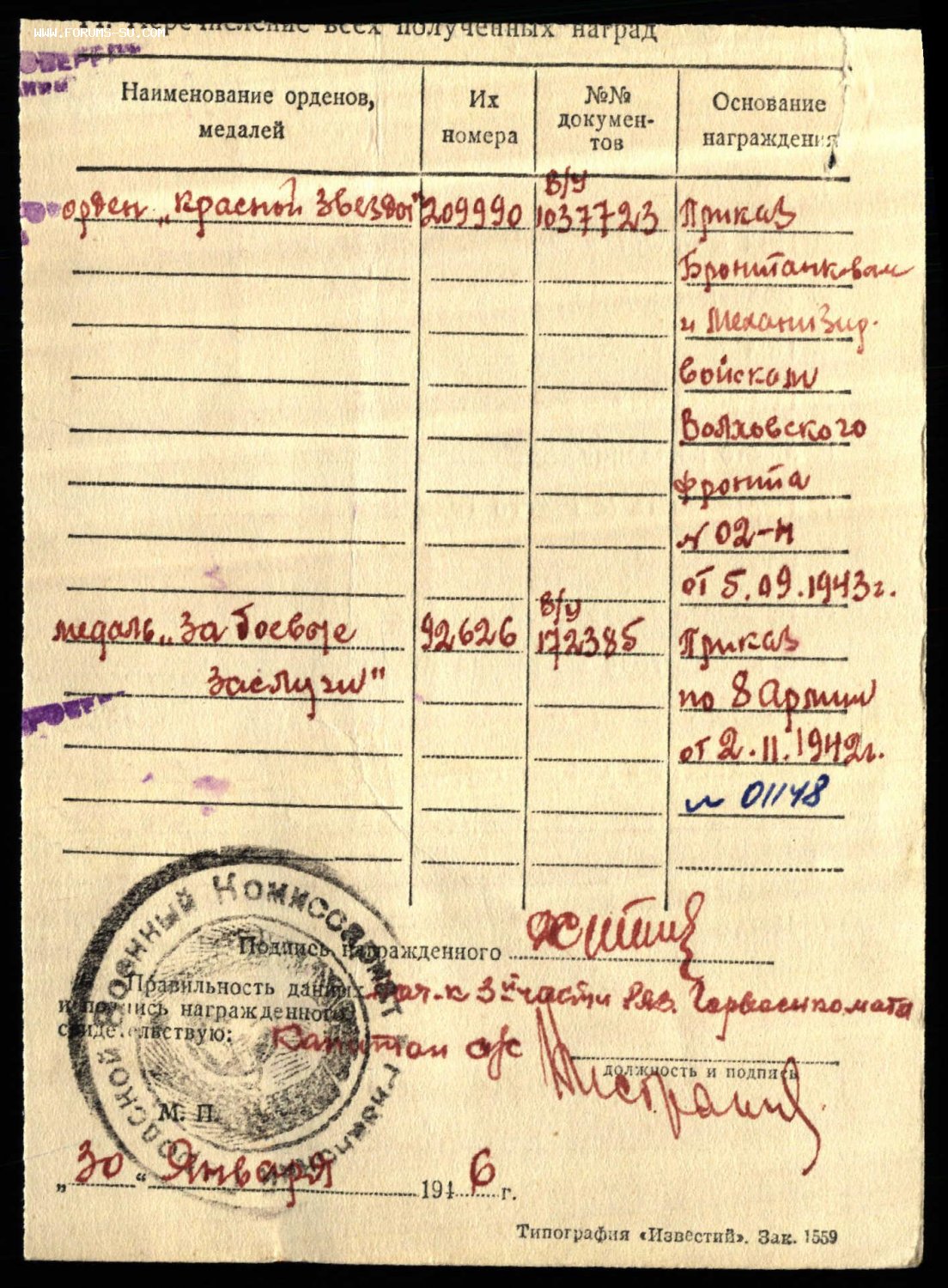 За периуда с 19,03,43 по 25,03,43 проявил смелость и самоотверженность восстановив под артиллерийским огнем и пустив в бой три танка Т-34.