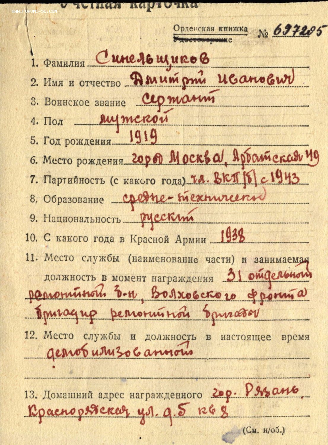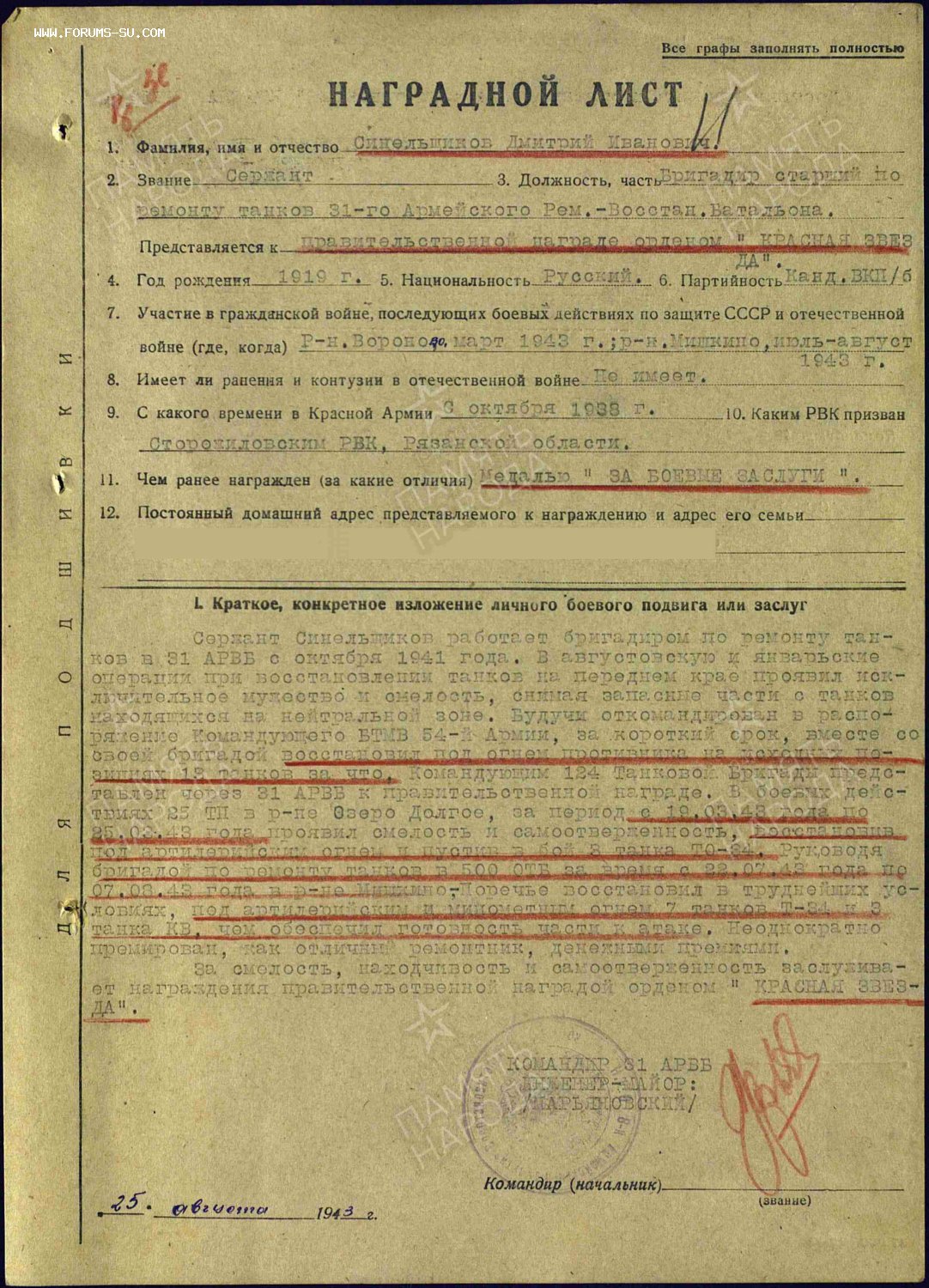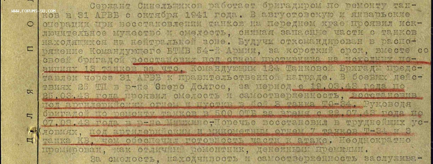 Сержант Синельщиков работал бригадиром по ремонту танков,вместе со своей бригадой восстановил под огнем противника на исходных позициях 13 танков.