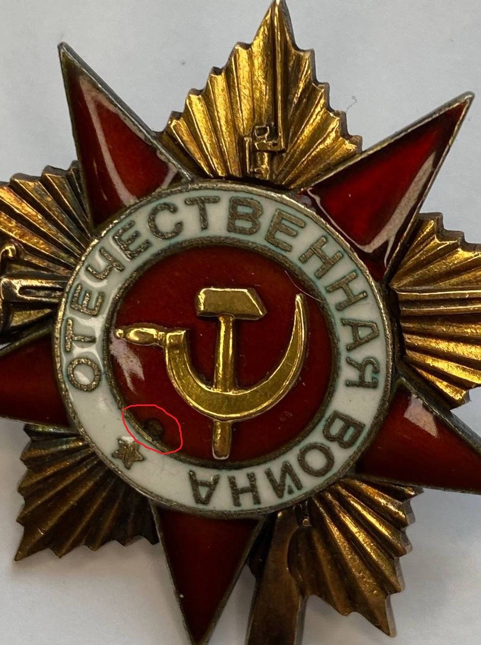 ОВ-1 № 251 671 - Луч на 12 часов холодная эмаль,цвет подобран хорошо.Брак эмали(я так вижу) на медальоне,показал на фото.