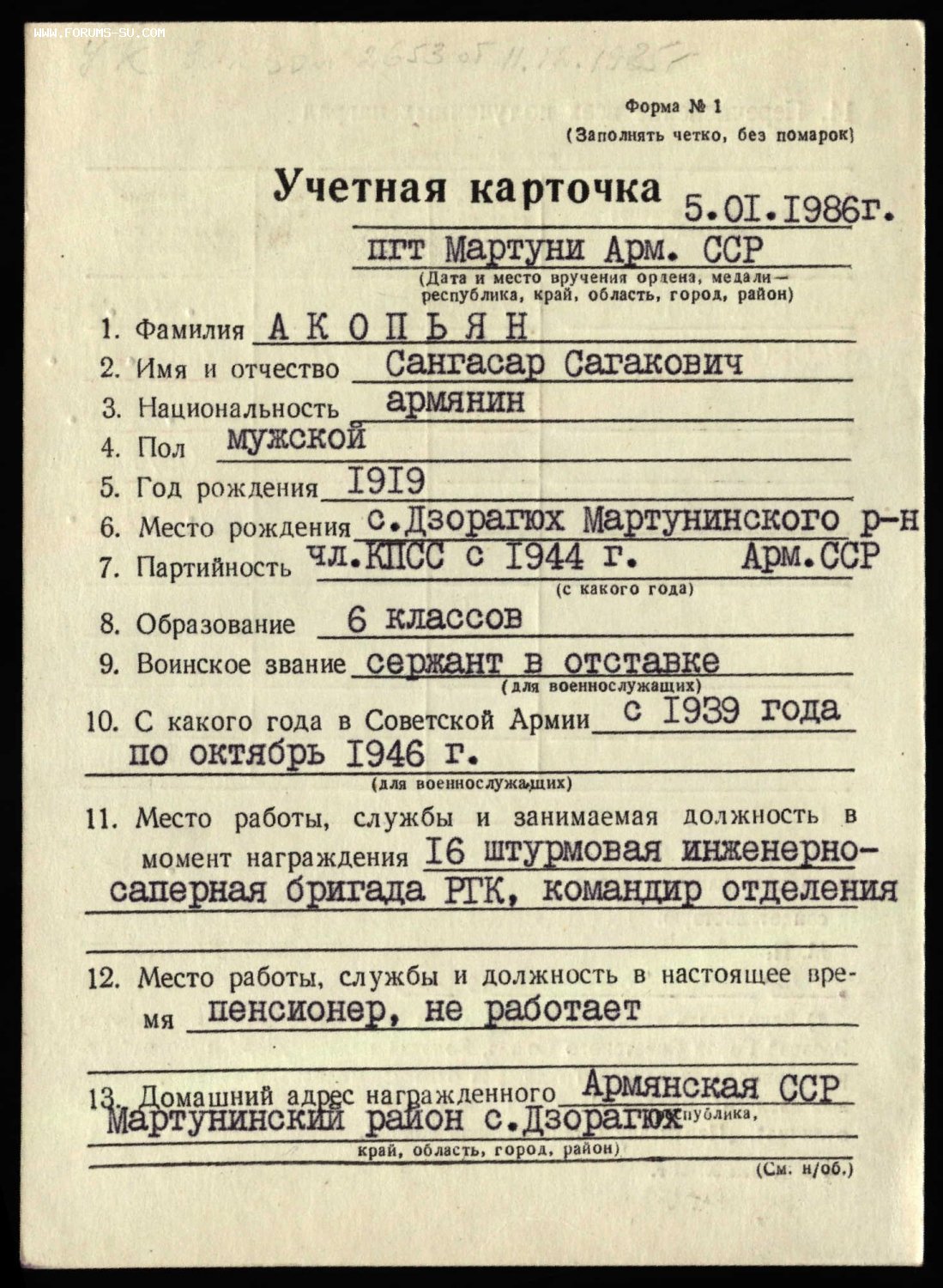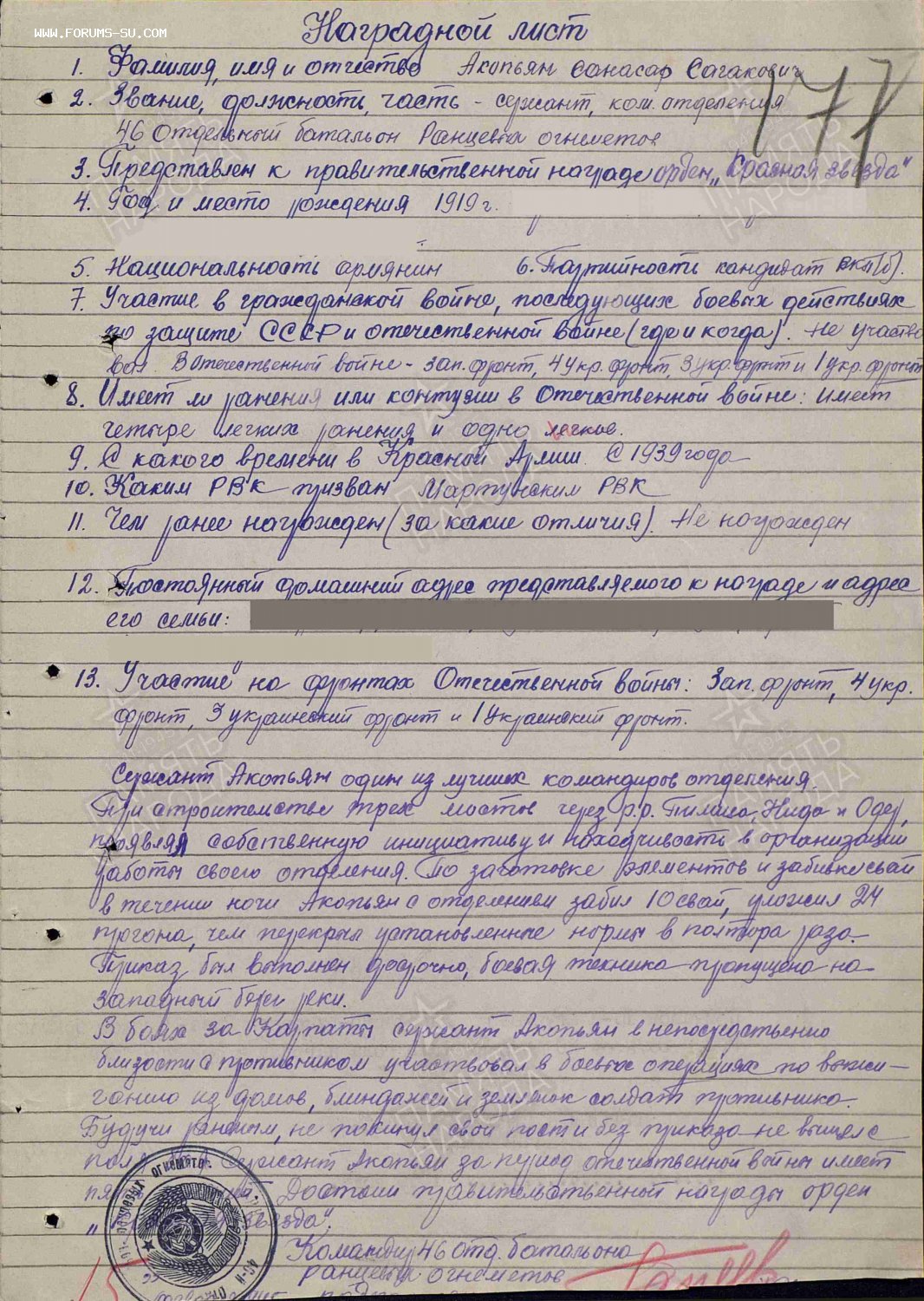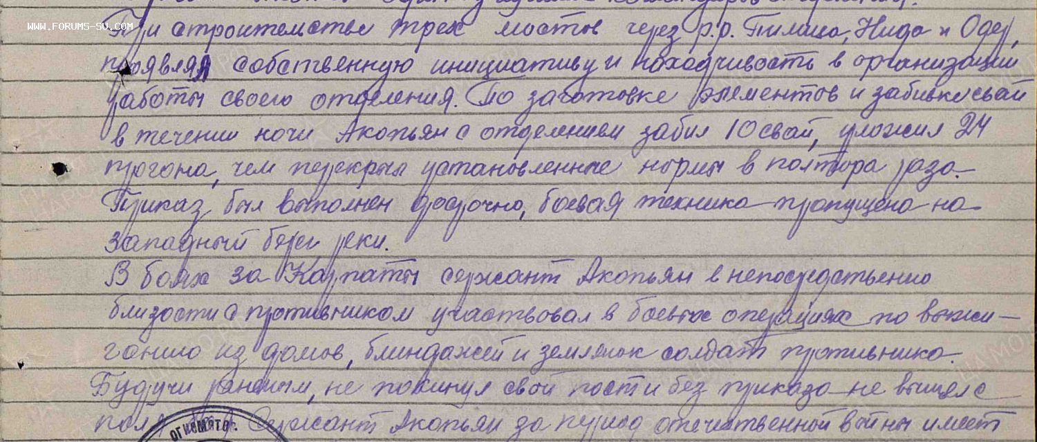 В боях за Карпаты,сержант Акопьян в непосредственной близости с противником,участвовал в боевых операциях,по Выжиганию из домов ,блиндажей и землянок