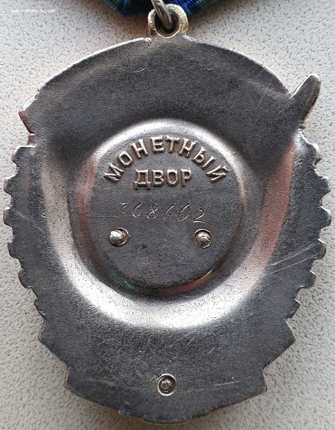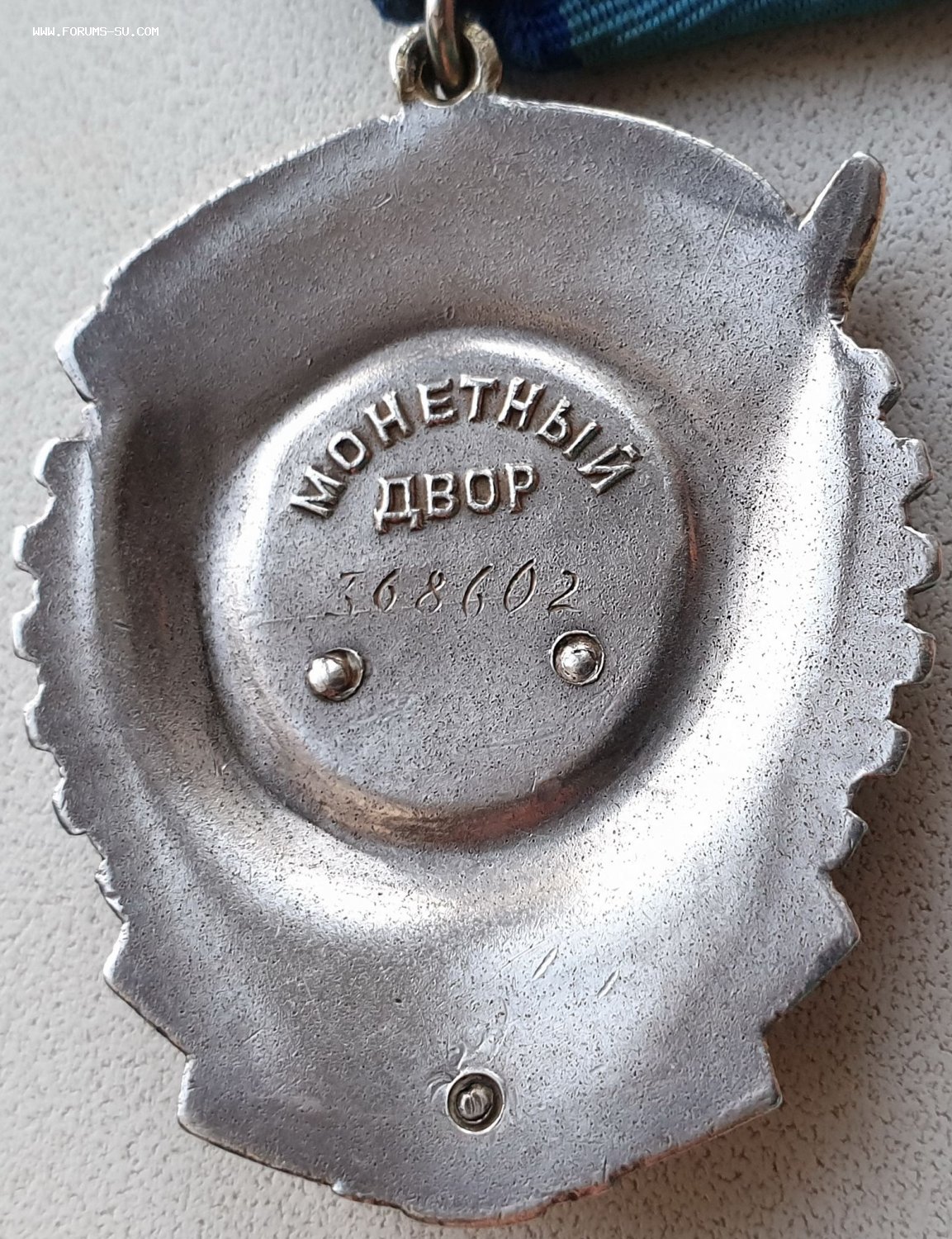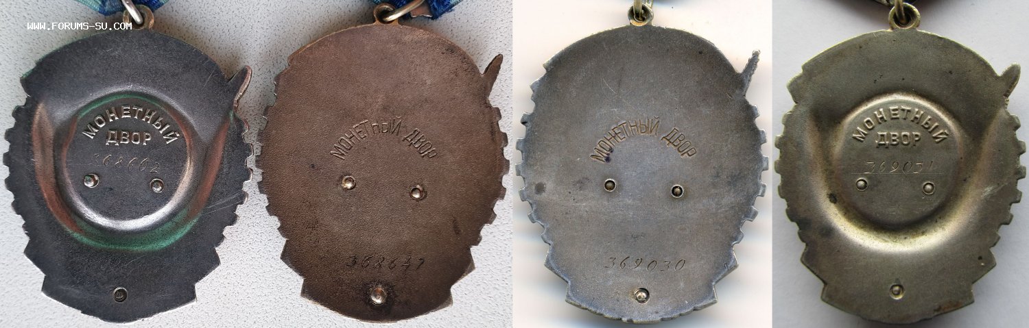 Тип 6 , вариант 1 , Разновидность 1. Серийный номер расположен в центральном круге, ниже слова ДВОР. Под номером проходит тонкая выпуклая горизонтальная риска. Минимальный известный номер ордена – 368602, максимальный – 369258 http://mondvor.narod.ru/ORbnLab4.htm