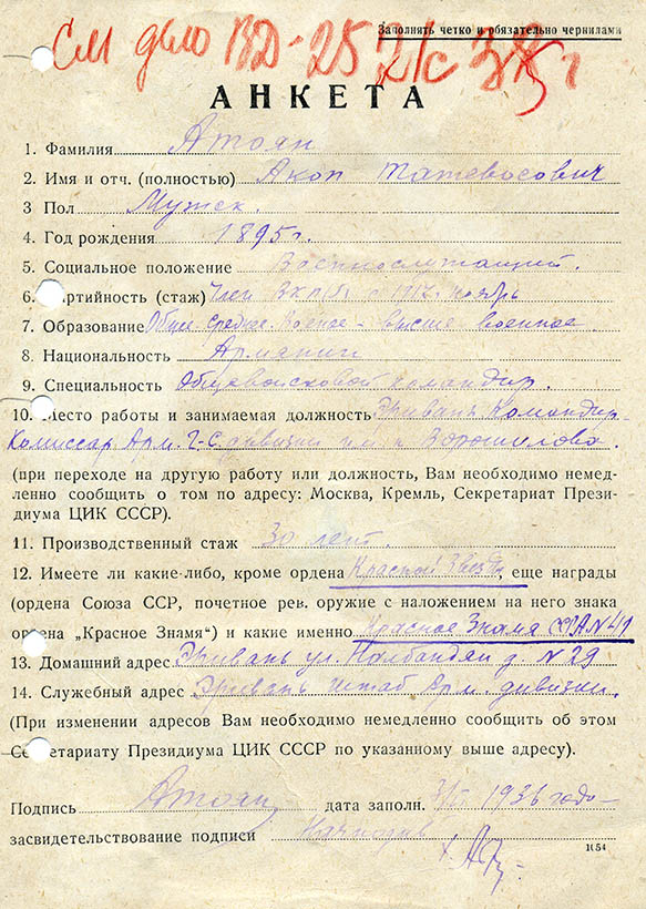 Отдам в хорошие руки 2 фотографии кавалера БКЗ и ТКЗ Арм.ССР Антояна А.Т. и Наградную анкету заполненную им после награждения в 1936г. орденом КЗ №1026.