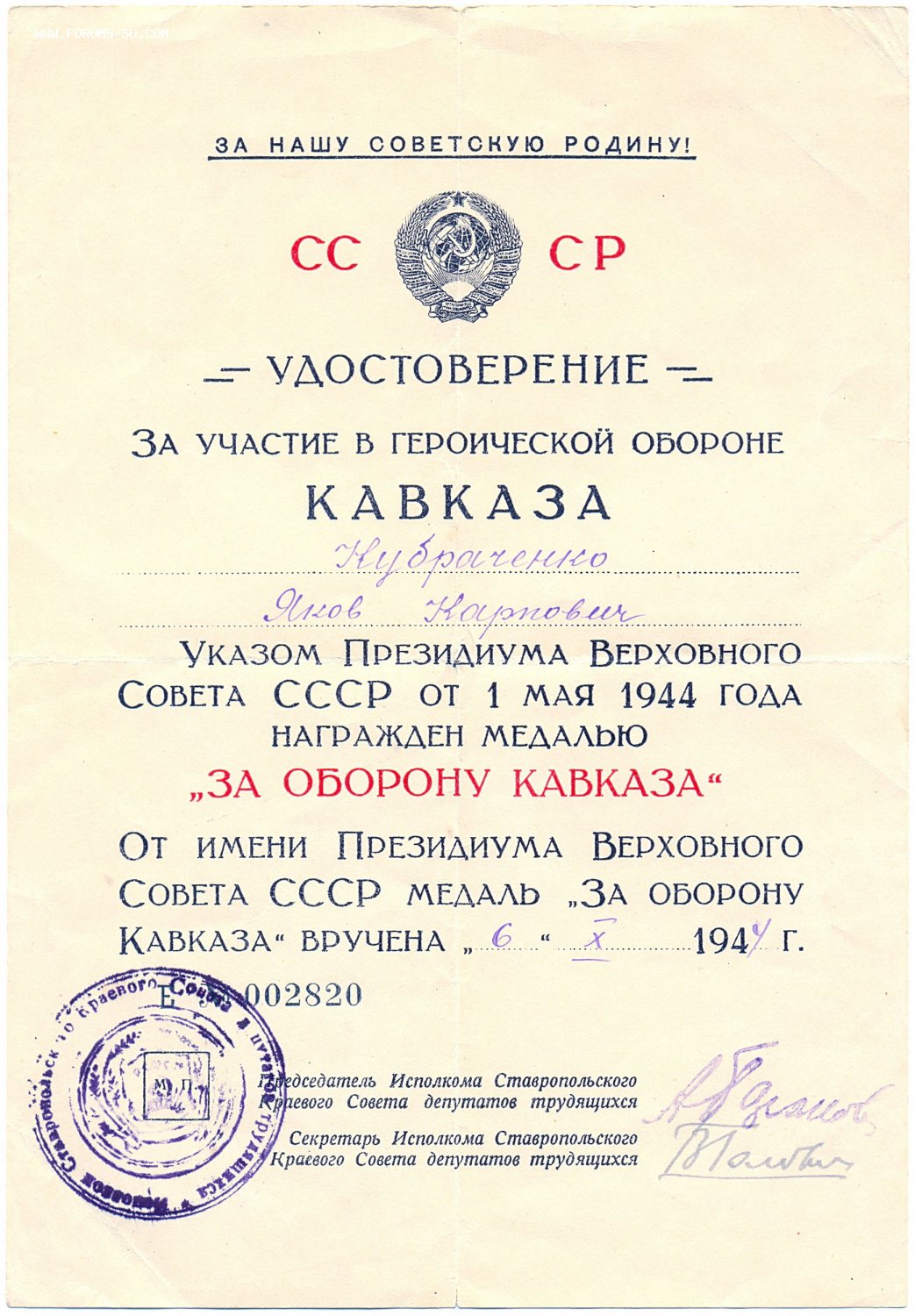 Орден вручён 27 апреля 1945 г. в Ставрополе. Есть копия учётной карточки на КЗ.