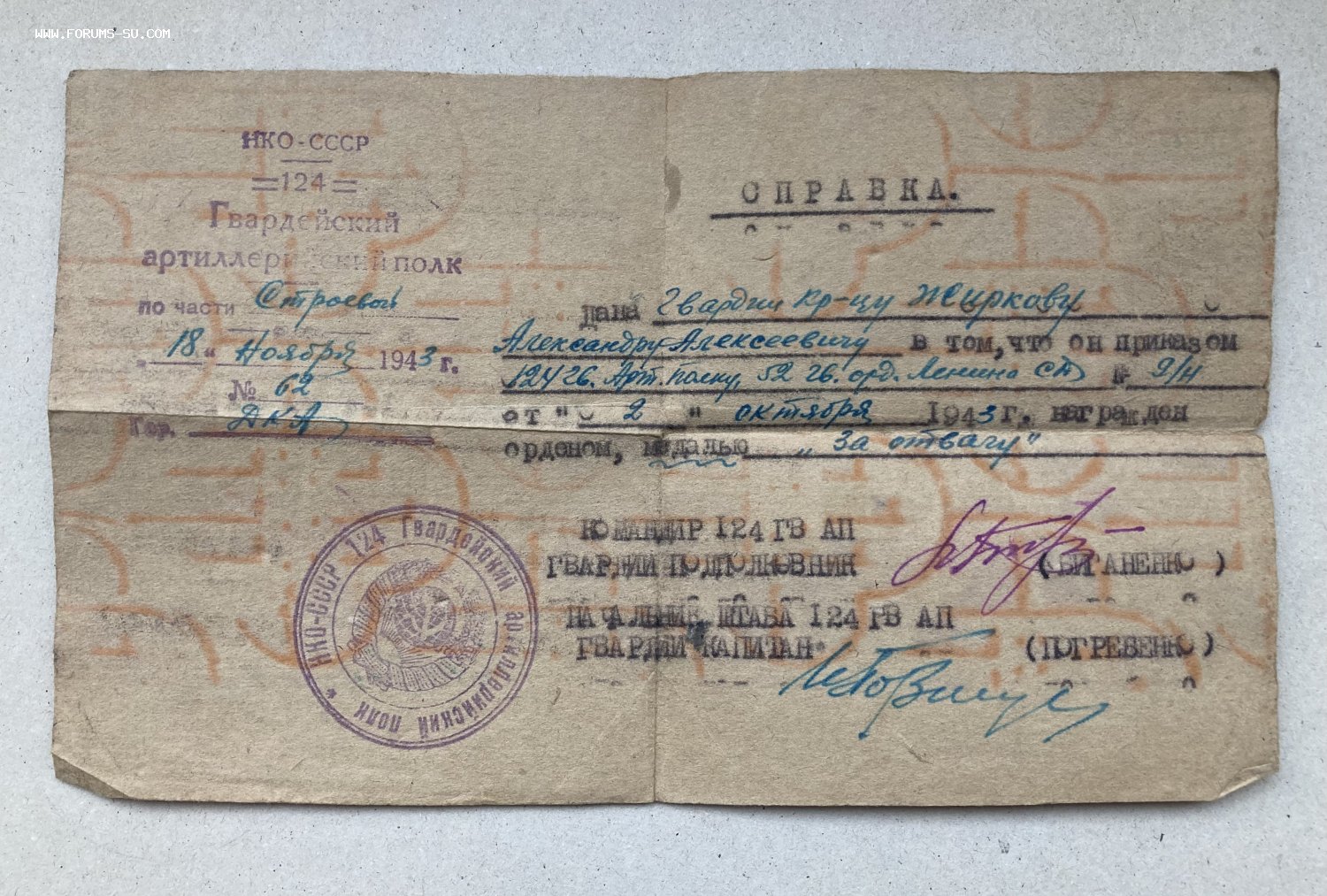 Орден на геройского артиллериста с документом и времянкой на две ранние медали «За Отвагу».