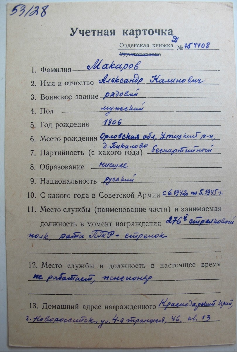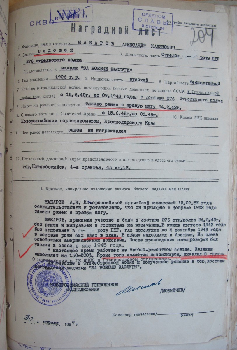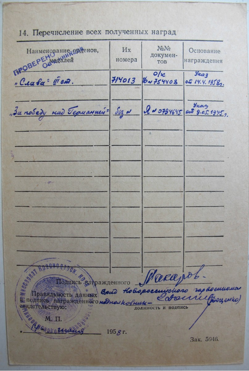 Красного Знамени, Суворова, Кутузова, Богдана Хмельницкого, Александра Невского, Ушакова, Нахимова, Отечественной Войны, Красной Звезды, Славы, За Службу Родине в ВС СССР