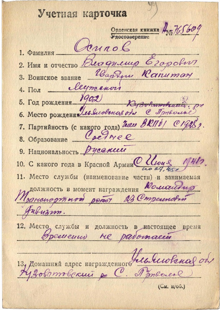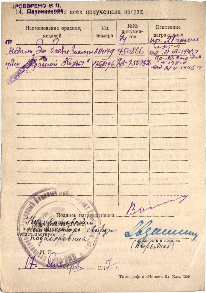 В 1943 г. кавалер награжден медалью БЗ (состоял в должности зам. командира роты по полит. части).