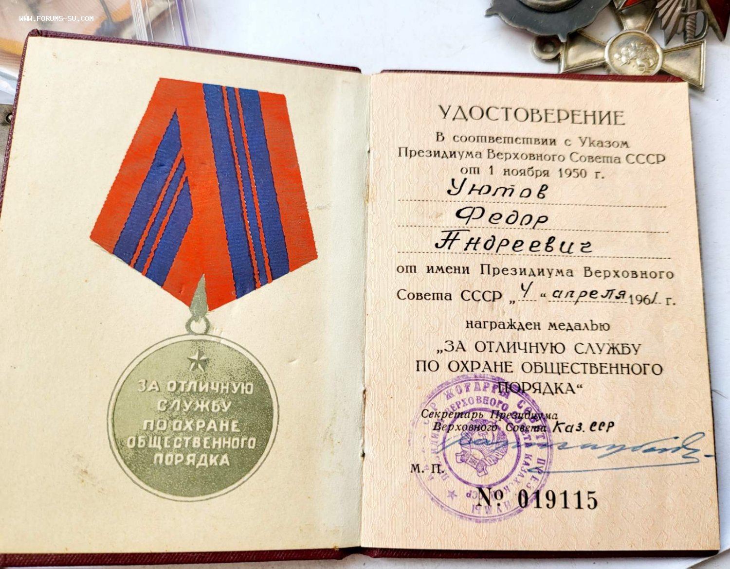 Так же на него есть доки на Выслугу МВД Каз ССР 50 лет мил 20 лет победы и БЗ если нужно спрашивайте.