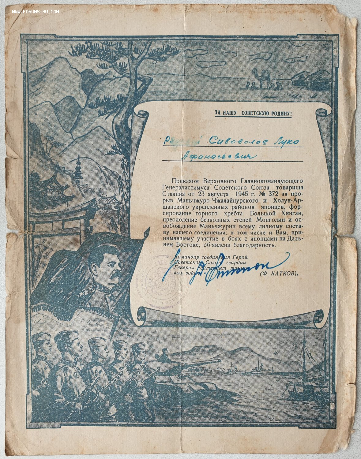 Подпись генерала танковых войск Каткова Ф.Г. кавалера Звезды № 518 https://warheroes.ru/hero/hero.asp?Hero_id=5620