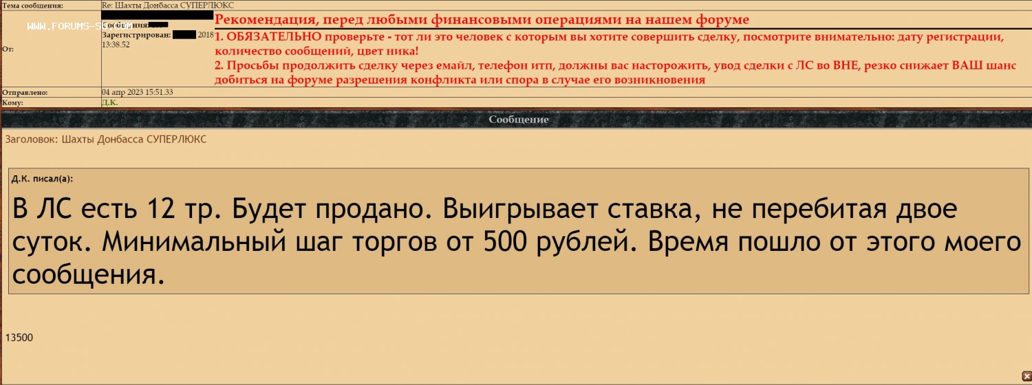 В ЛС есть 12 тр. Будет продано. Выигрывает ставка, не перебитая двое суток. Минимальный шаг торгов от 500 рублей. Время пошло от этого моего сообщения.