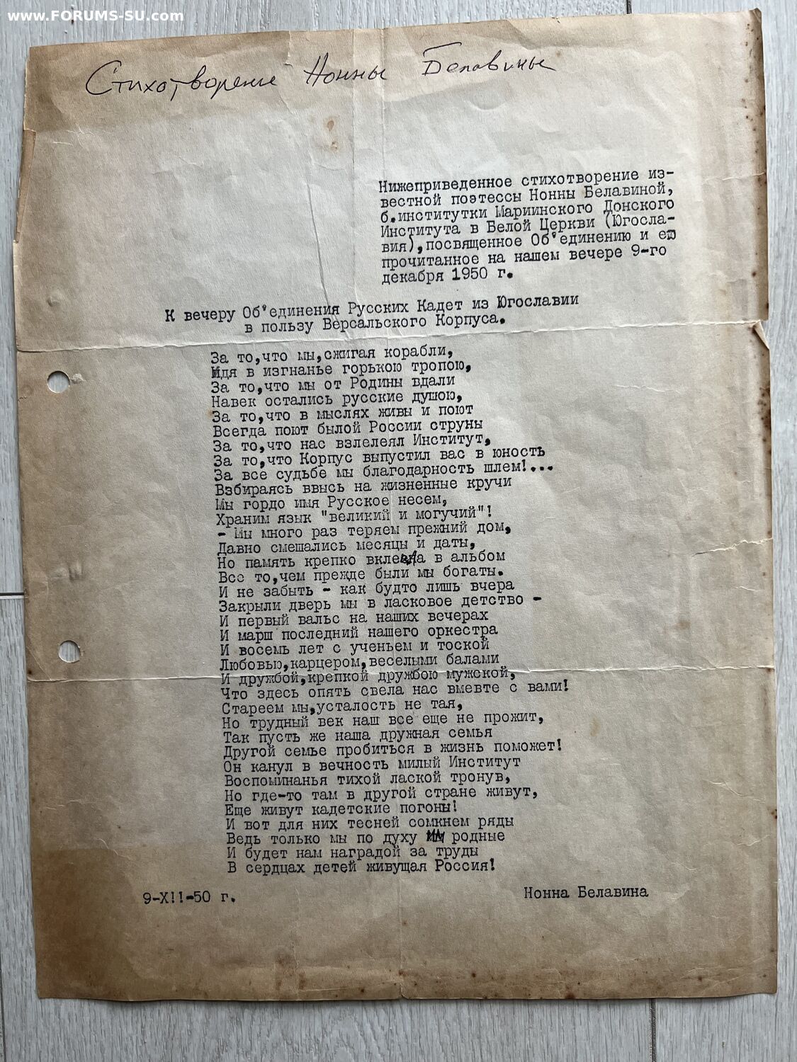 Стихотворение поэтессы Нонны Белавиной " К вечеру Объединения Русских Кадет из Югославии в пользу Версальского корпуса.