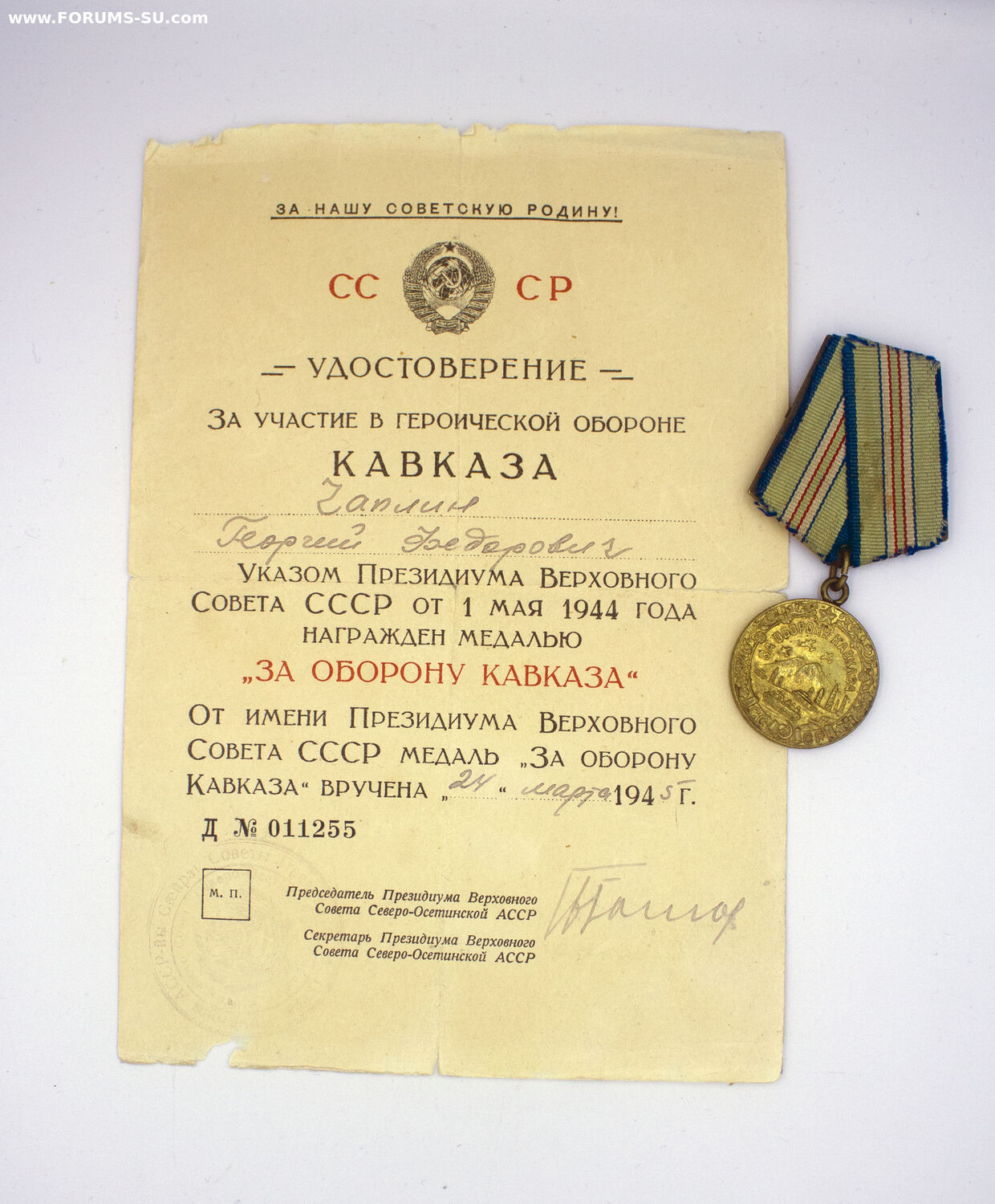 КАВКАЗ НОМЕРНОЙ НА ДОКЕ СЕВЕРО-АСЕТИНСКОЙ АССР RМедаль За оборону Кавказа с документом