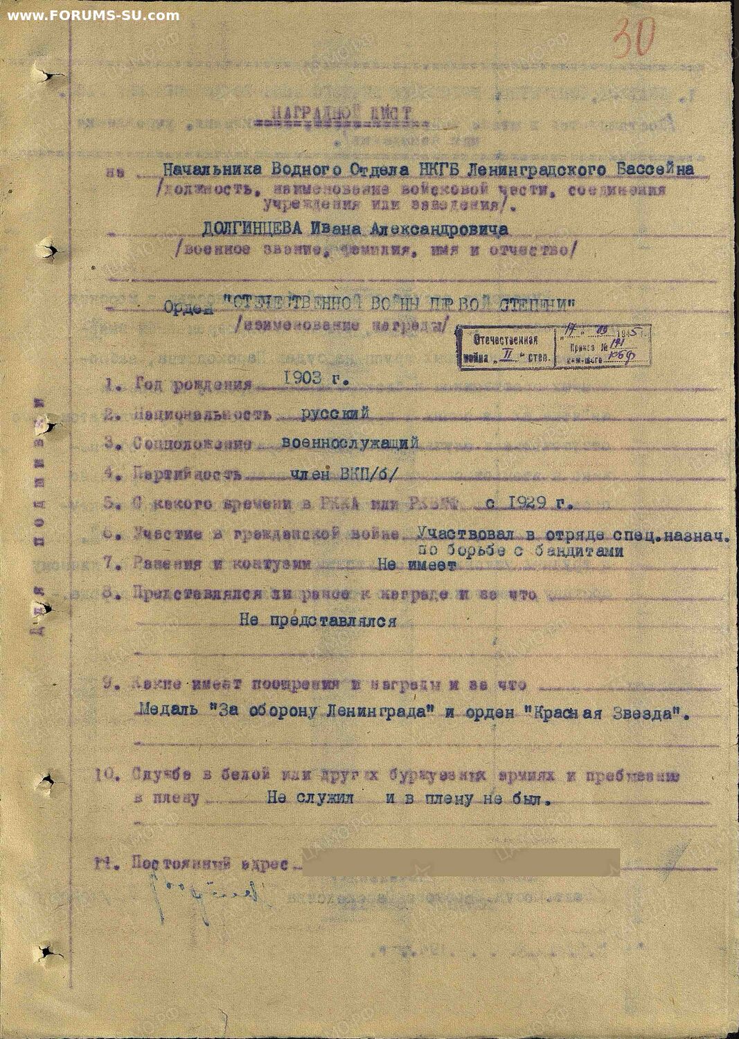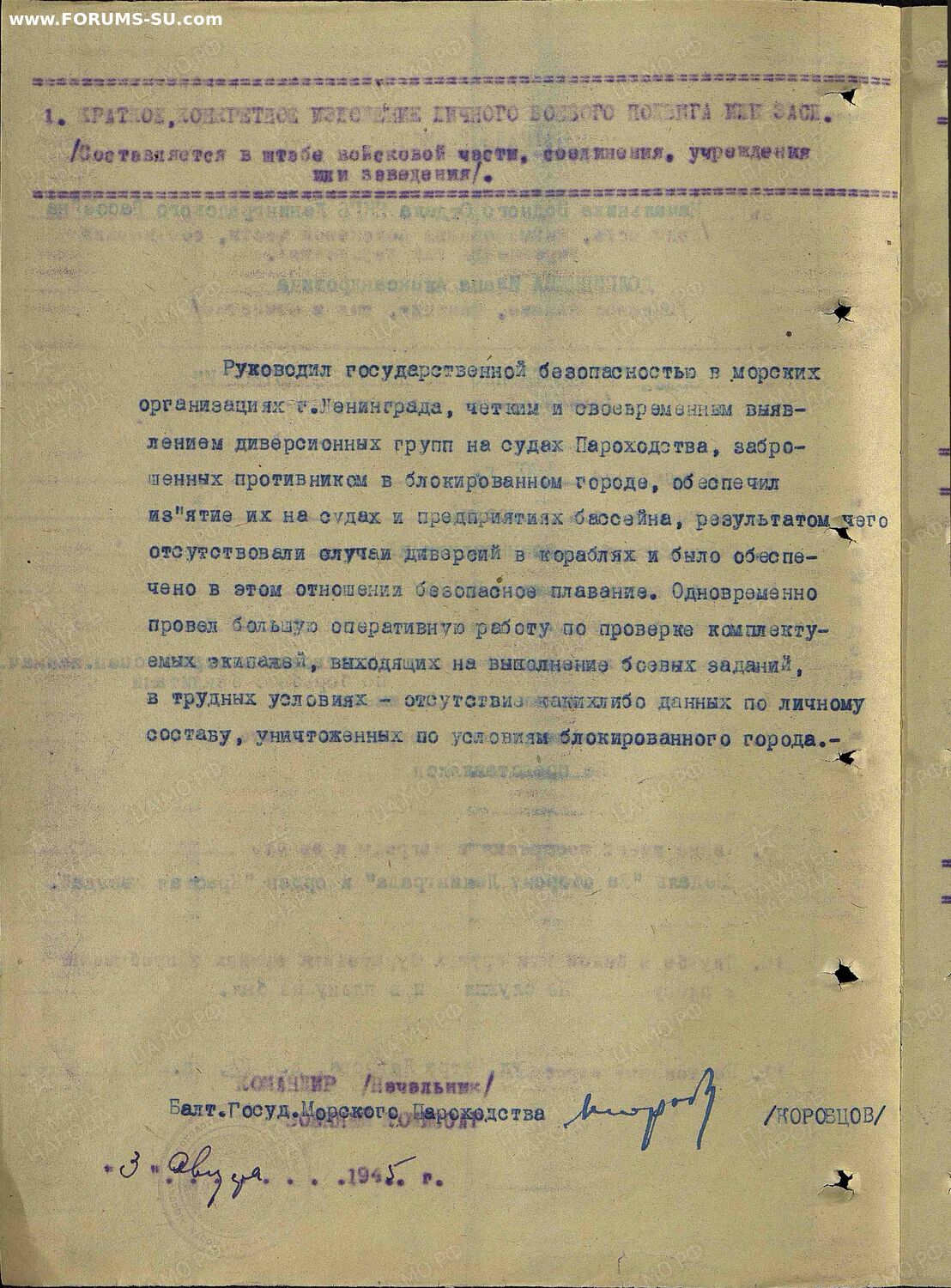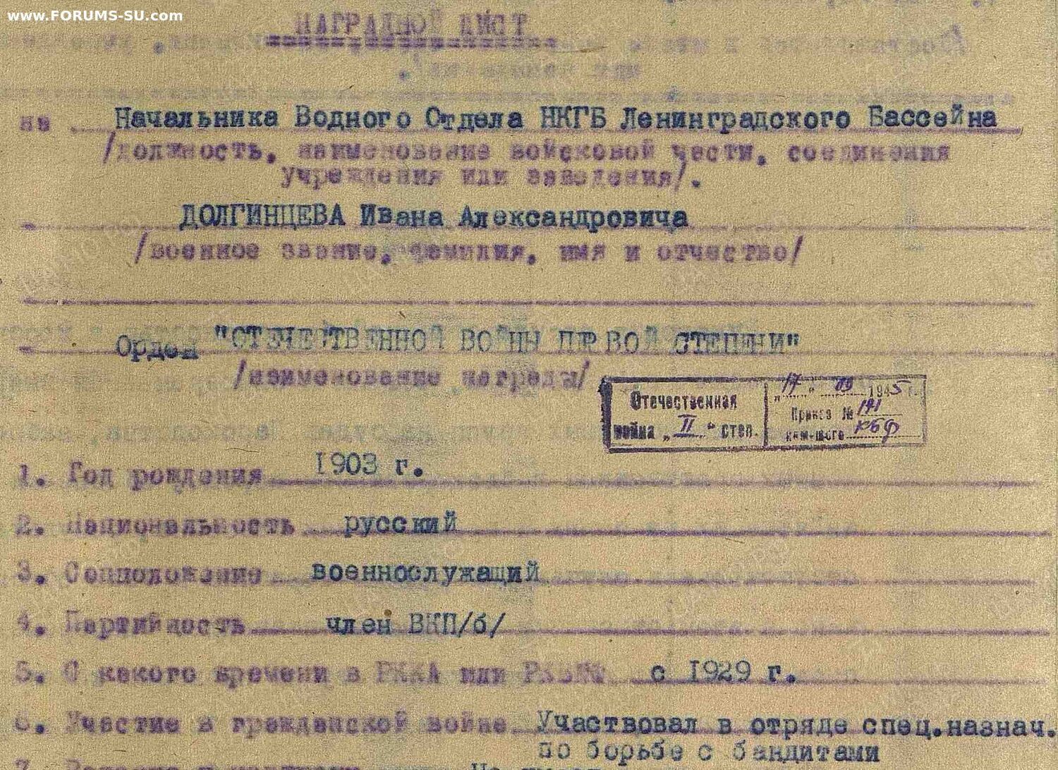 ⬤ на 17.09.1945 нач. водного отдела НКГБ Ленинградского бассейна Приказ Балтийского флота № 171 от 17.09.1945