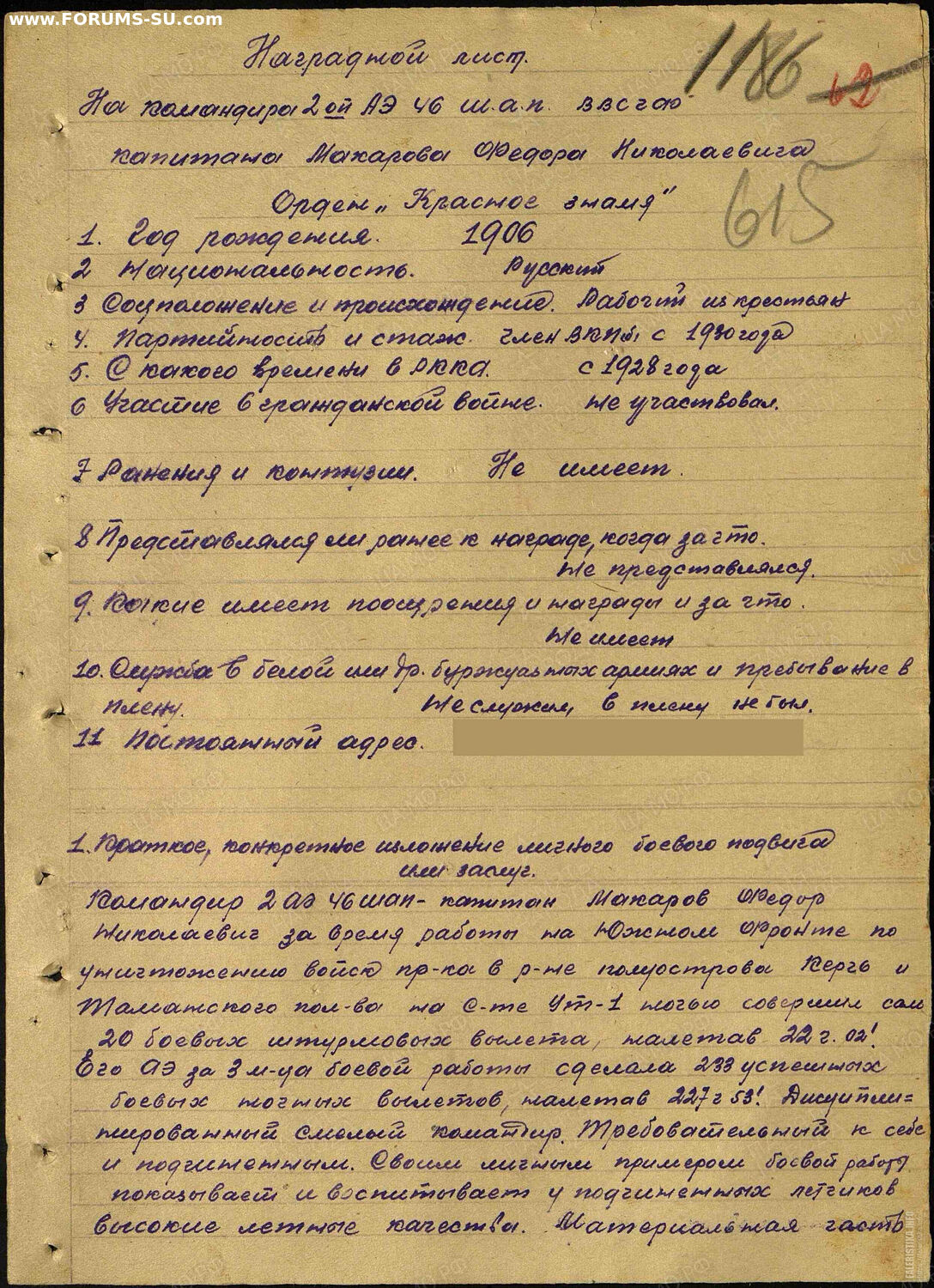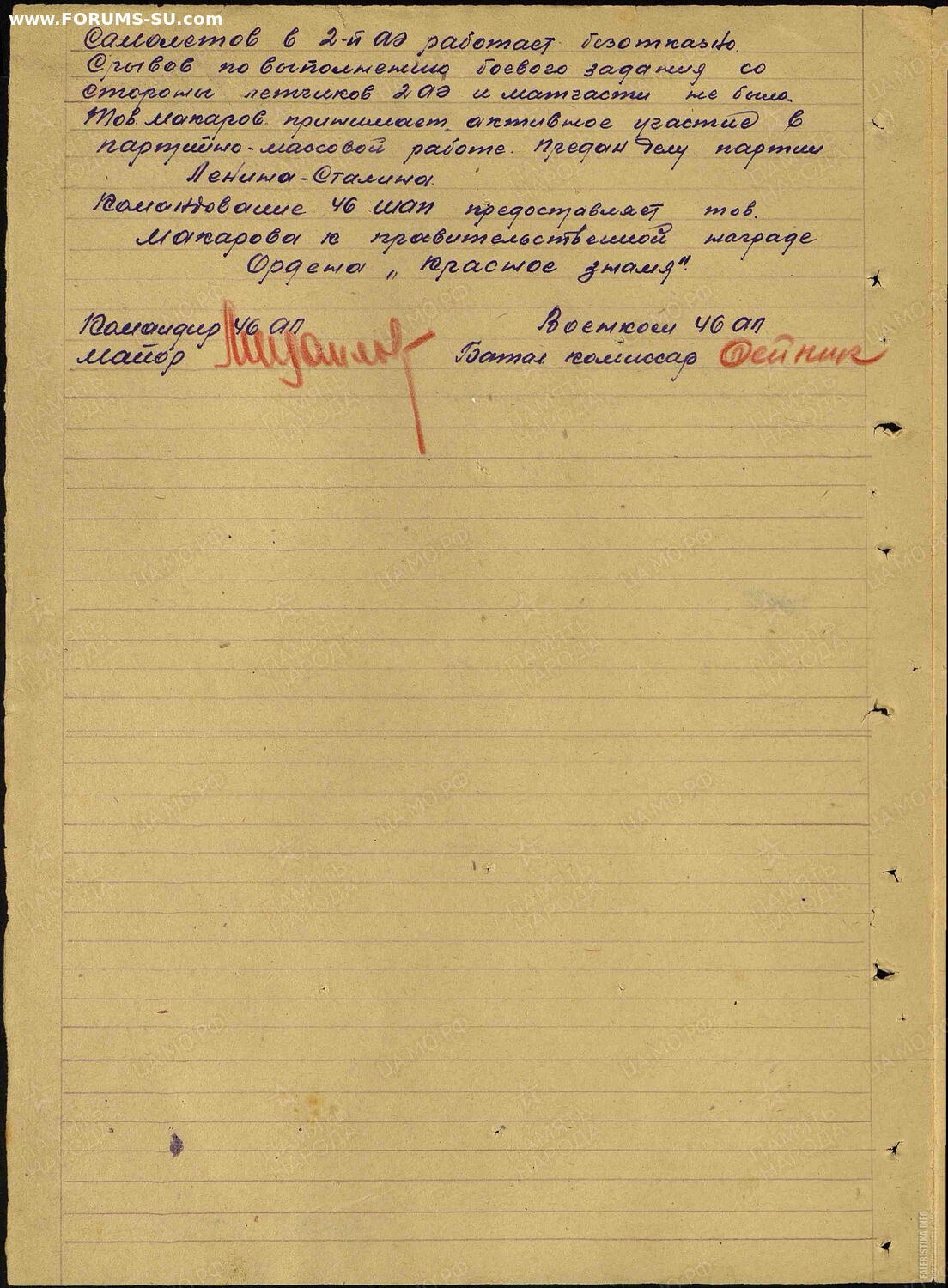 «Весна 1942 года. – Фашистская армия грабителей и убийц, уже битая нашей Красной Армией под Москвой, Тихви Ростовом, собравшись с силами начала новое наступление. Жизненным центром нашей великой родины угрожал опасность. В своем приказе № 55 от 22.02.42 г. товарищ Сталин требовал, «Чтобы все новые и новые воинские час фронт ковать победу над озверелым врагом», рассматривая в этом один из источников силы и могущества Красн Приказом Народного Комиссара ВМФ адмирала Кузнецова от 10.05.42 г. при ВМАУ им. Сталина был сформирован штурмовой ночной Авиационный полк двухэскадрильного состава. На вооружении полка состояли легкие спорти самолеты «УТ-1», вооруженные пулеметами «ШКАС» и «РС».