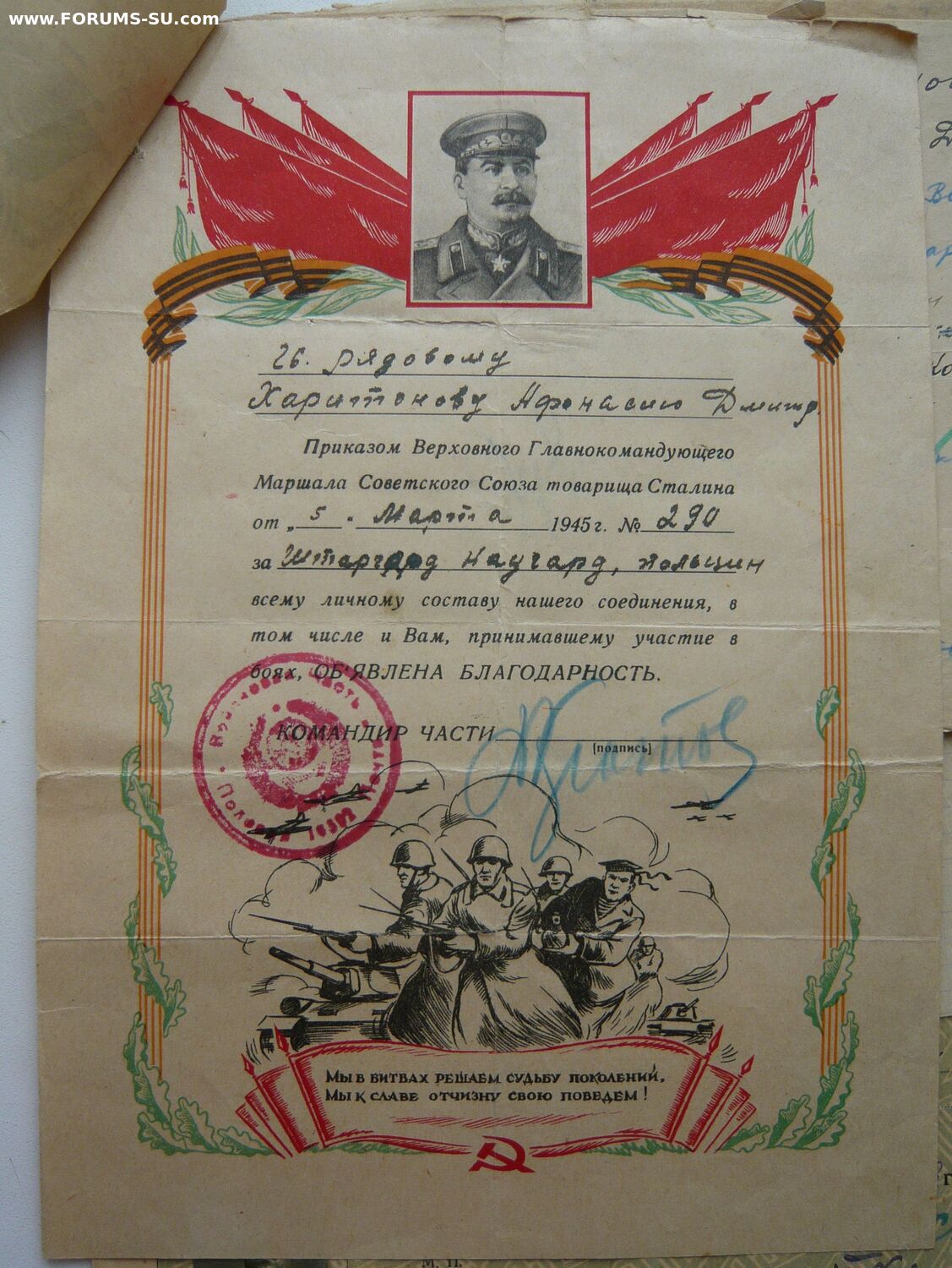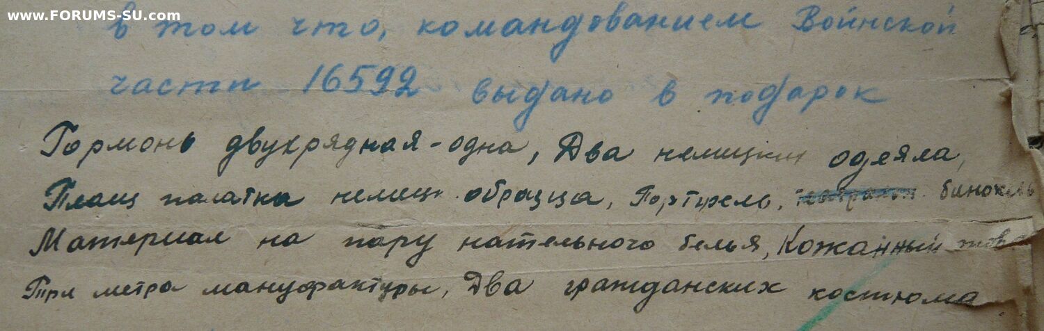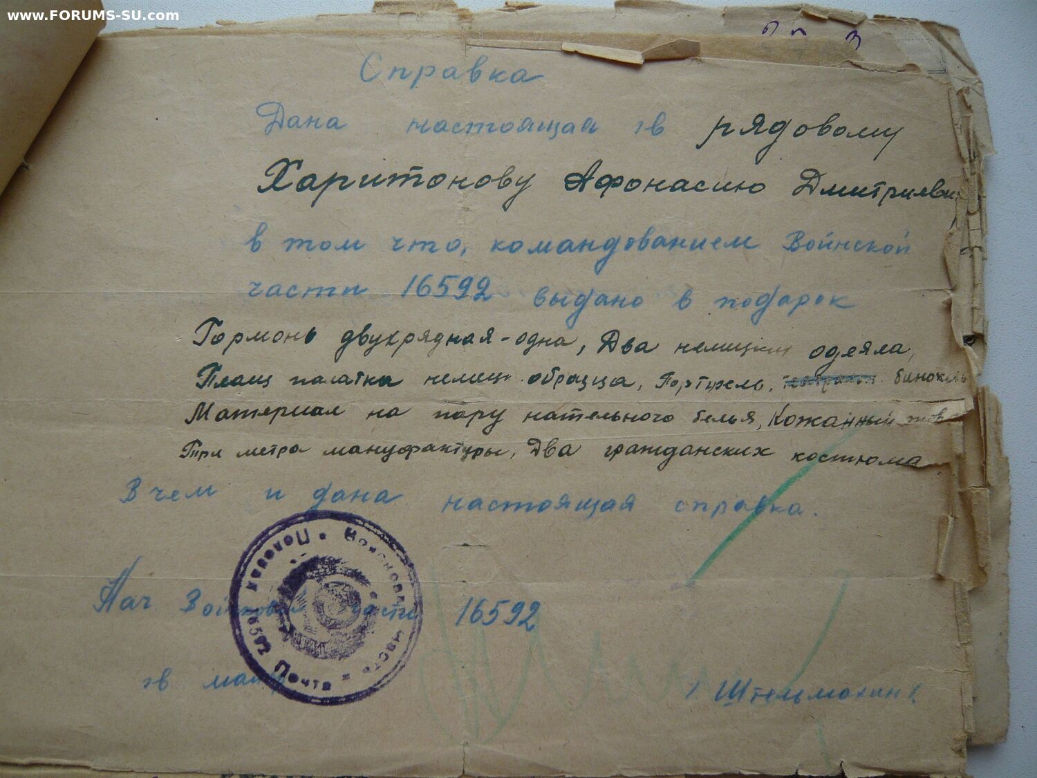 "Справка дана настоящая гв. рядовому Харитонову Афанасию Дмитриевичу в том, что командованием воинской части 16592 выдано в подарок: