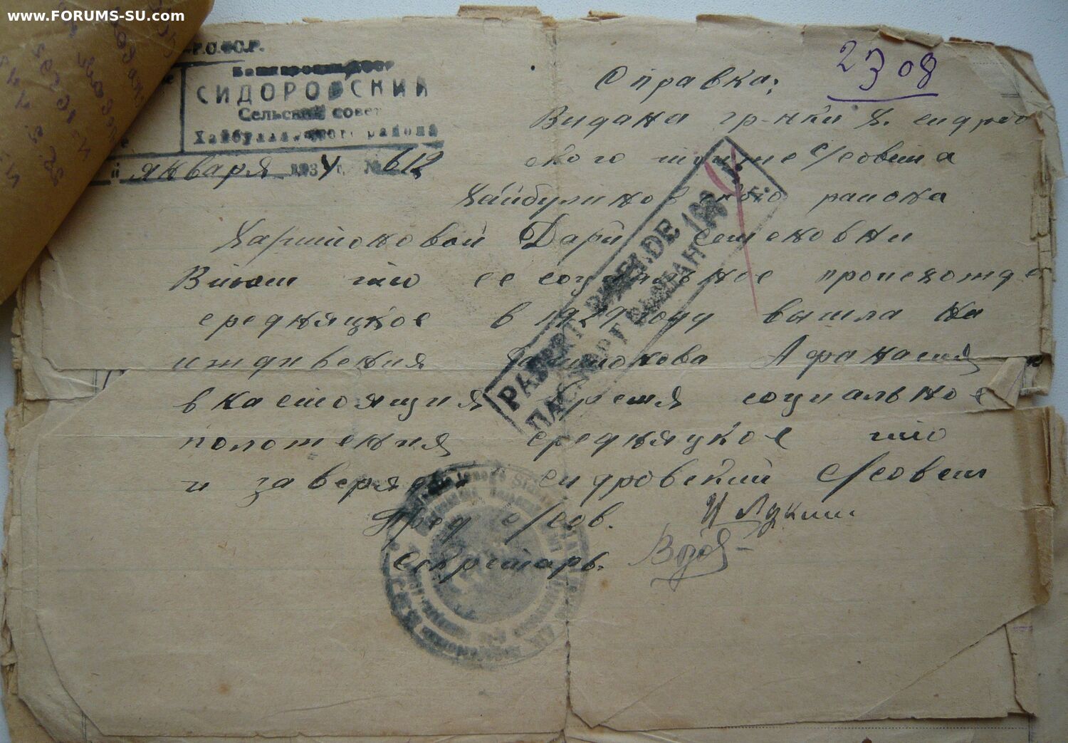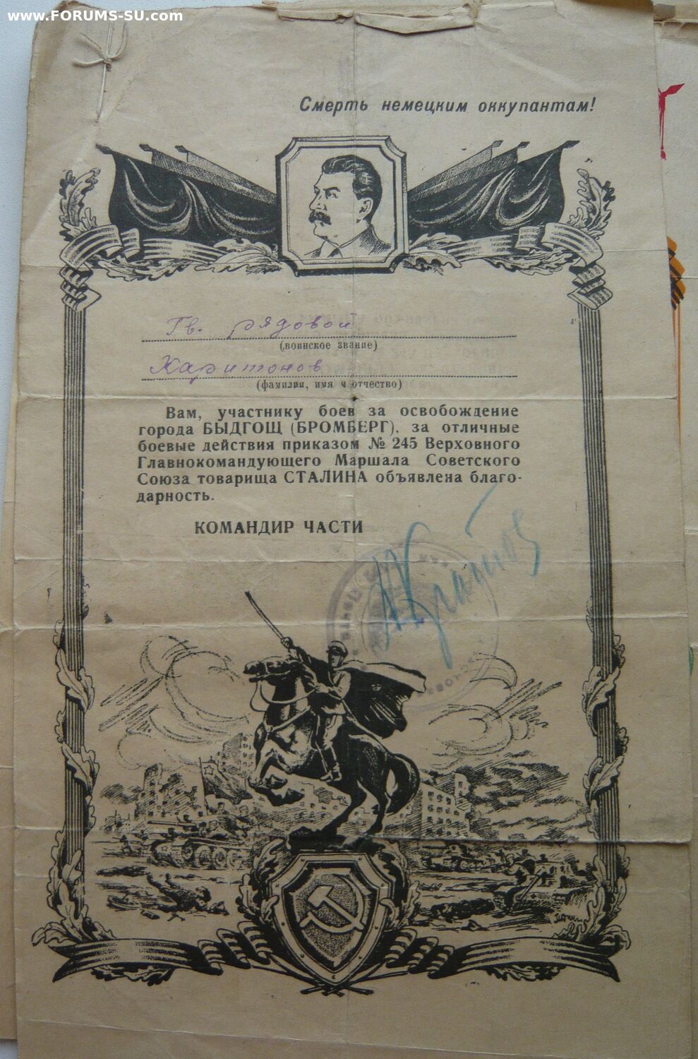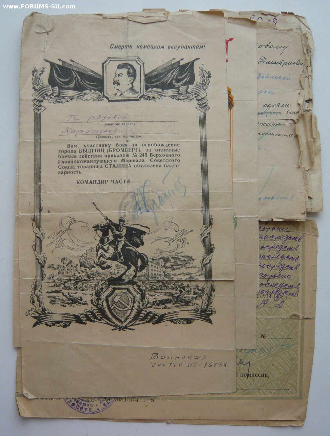 "Справка дана настоящая гв. рядовому Харитонову Афанасию Дмитриевичу в том, что командованием воинской части 16592 выдано в подарок: