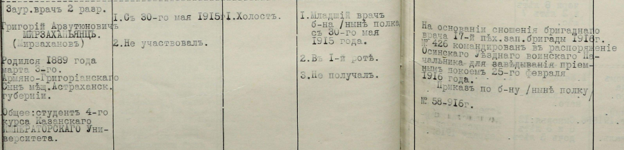 25.02.1916г. – Титулярный Советник, командирован в распоряжение Осинского Уездного Воинского Начальника для заведывания Приёмным покоем (Пр. по полку № 58 от 1916г.; на основании сношения Бригадного Врача 17-й пехотной запасной бригады № 426 от 1916г.).