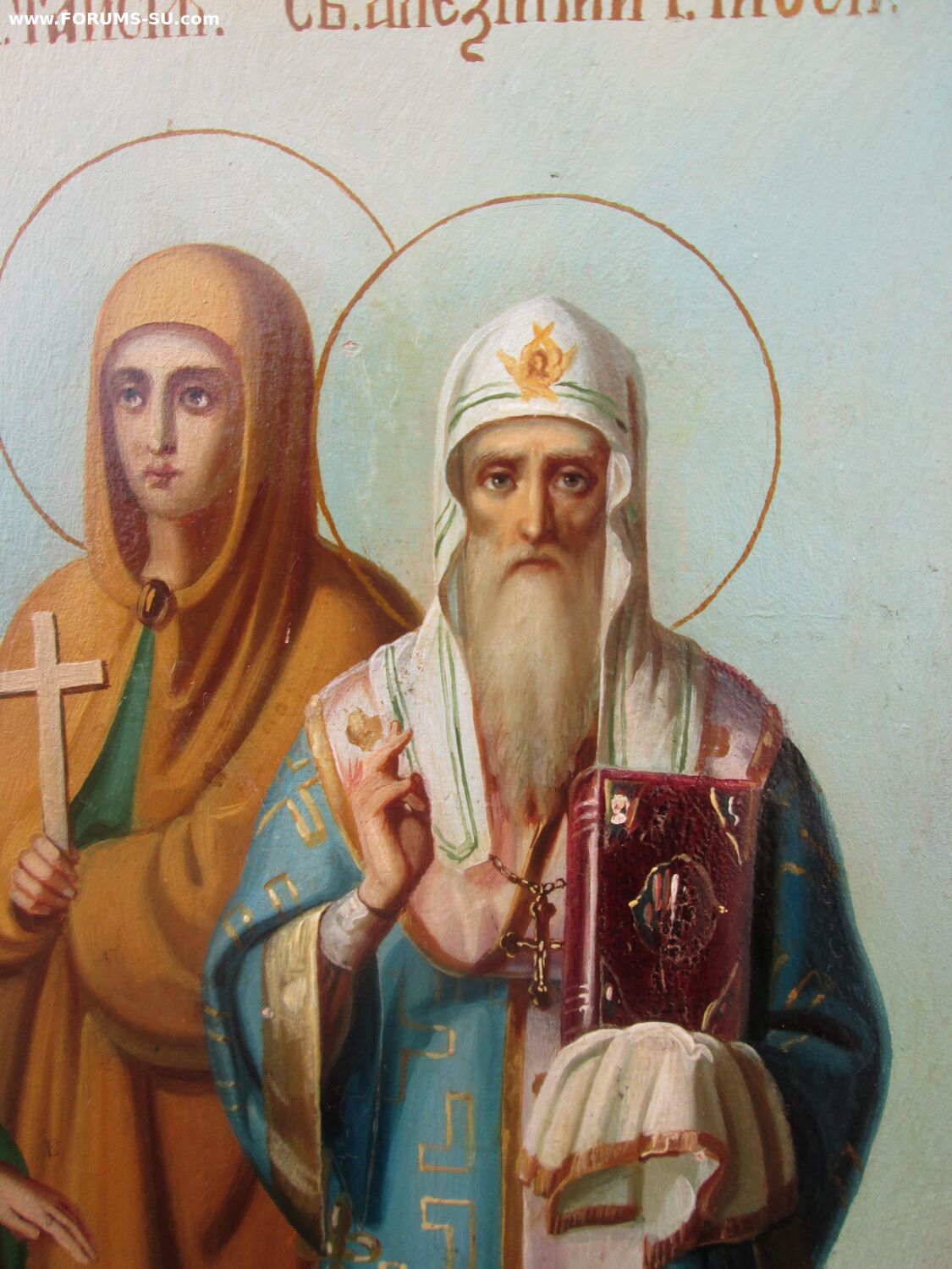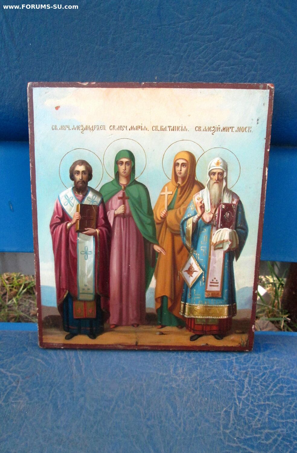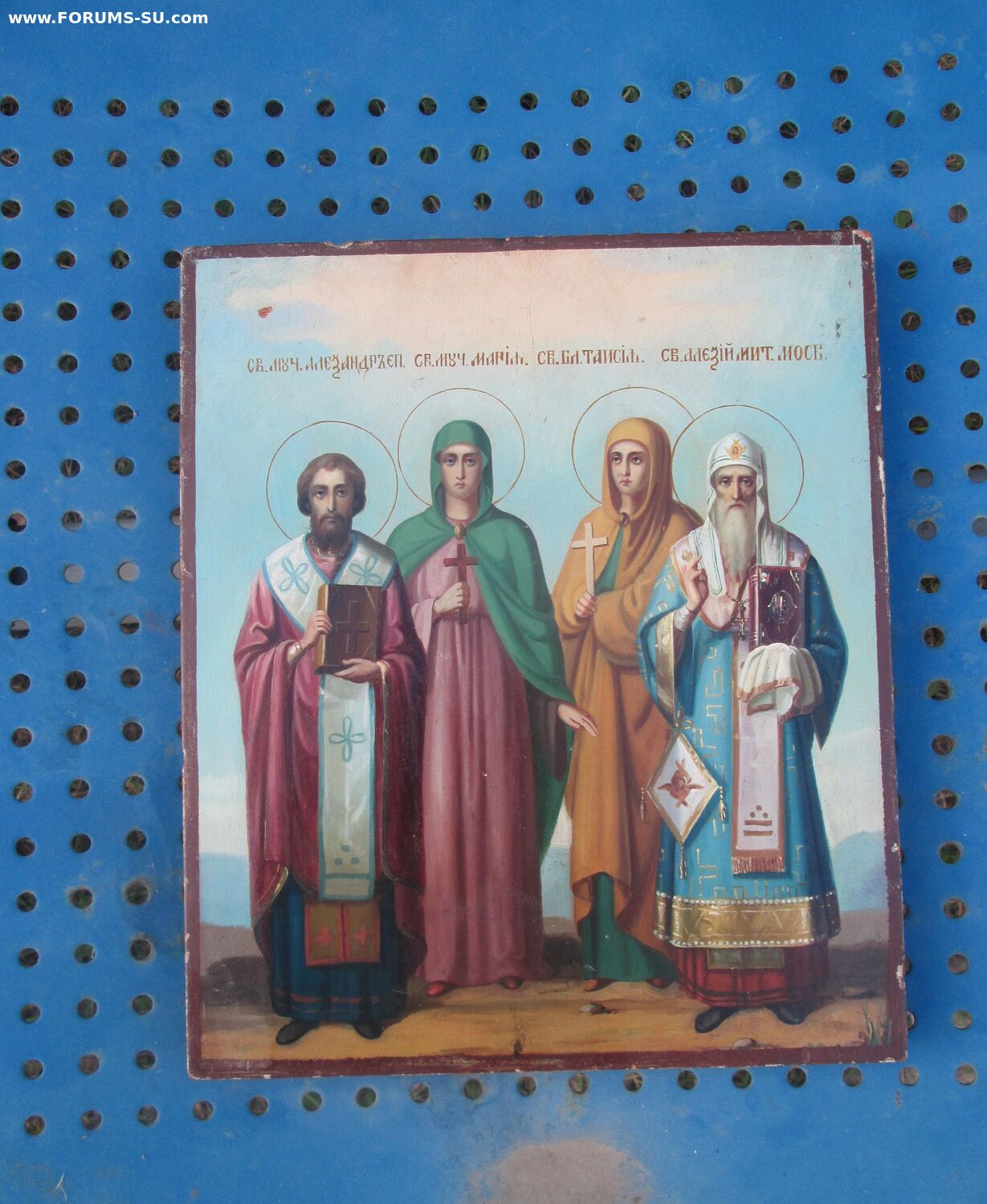 В продаже старинная заказная Икона. Икона красивая, яркая, сочная, с очень мощной положительной энергетикой. Академическое письмо высокого уровня 19 века, без реставрации. Киотного хранения, состояние люкс. Именики :Святой мученик Епископ Александр, Святая мученица Мария, Святая блаженная Таисия, Святой Алексей митрополит Московский.