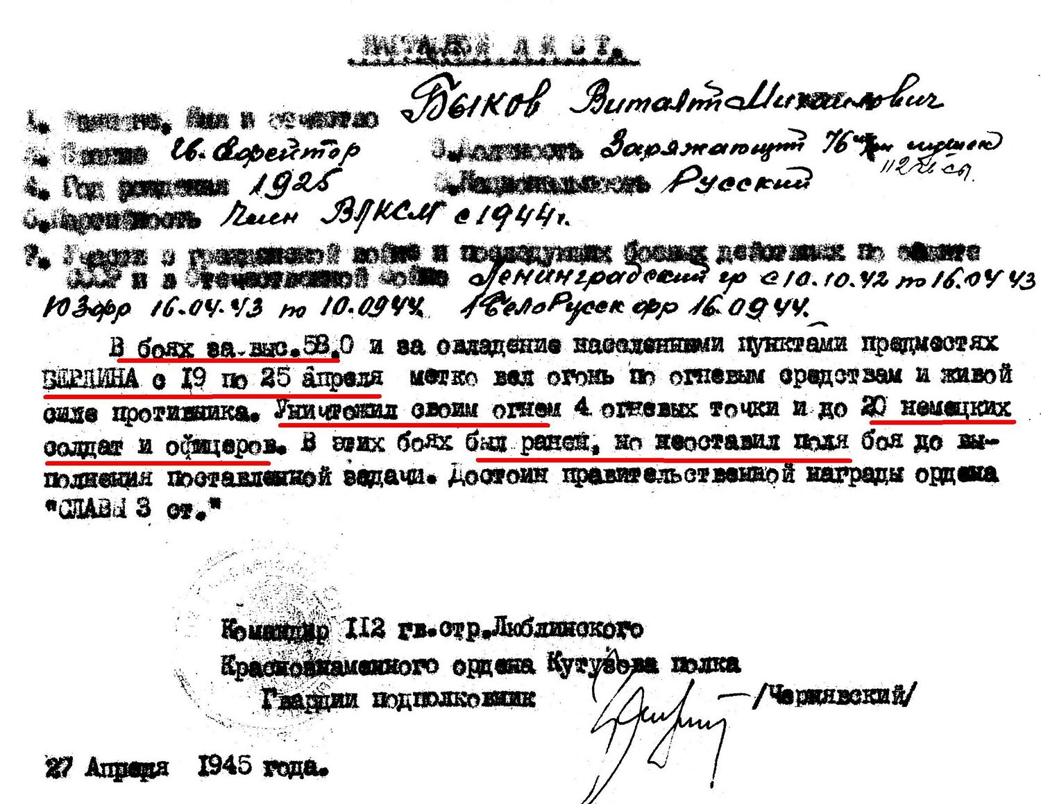 Подвиг : В боях ЗА ВЫСОТУ 58,0 и за овладение населённых пунктов в предместьях БЕРЛИНА 19-25 АПРЕЛЯ