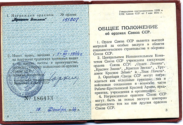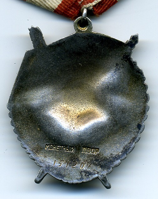 "Вариант 3. Ордена третьего варианта также изготавливались на КМД. Реверс ордена имеет заметную рельефность. Клеймо выполнено горизонтально в одну строку. В отличие от предыдущего варианта, оба слова клейма прямые, без изгибов. Буквы в обоих словах одинакового размера. Третий вариант был выпущен двумя партиями, поэтому встречается в двух номерных интервалах. Первая партия была изготовлена, вероятно, в 1945 году. Для первого интервала минимальный известный номер 137331, максимальный - 187737."