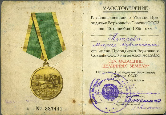 Медали Серп и Молот, За Трудовую Доблесть, За Трудовое Отличие, За Доблестный Труд в Великой Отечественной Войне,За Восстановление Предприятий Чёрной Металлургии Юга, За Восстановление Угольных Шахт Донбасса, За Освоение Целинных Земель, За Строительство БАМ, За Преобразование Нечерноземья РСФСР, За Освоение Недр и Развитие Нефтегазового Комплекса Западной Сибири, Ветеран Труда