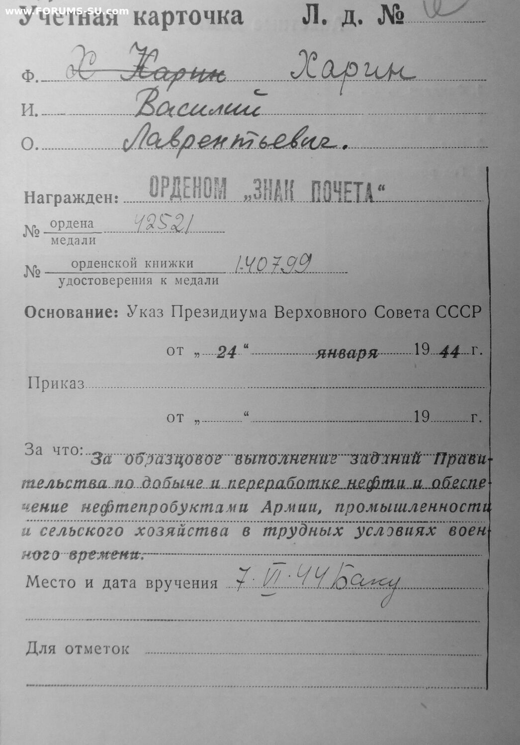 Указ 24 января 1944 г., за образцовое выполнение заданий правительства по добыче и переработке нефти и обеспечение нефтепродуктами Красной Армии, промышленности и сельского хозяйства в трудных условиях военного времени.