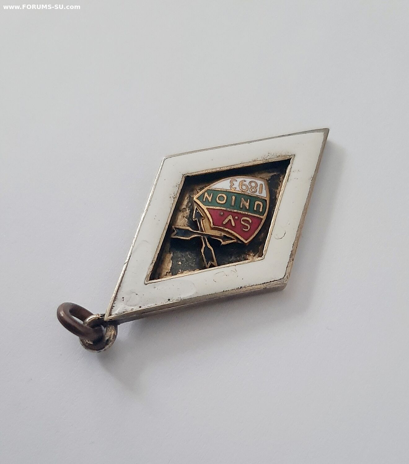 Серебро. Есть пластинчатый скол белой эмали возле ушка.