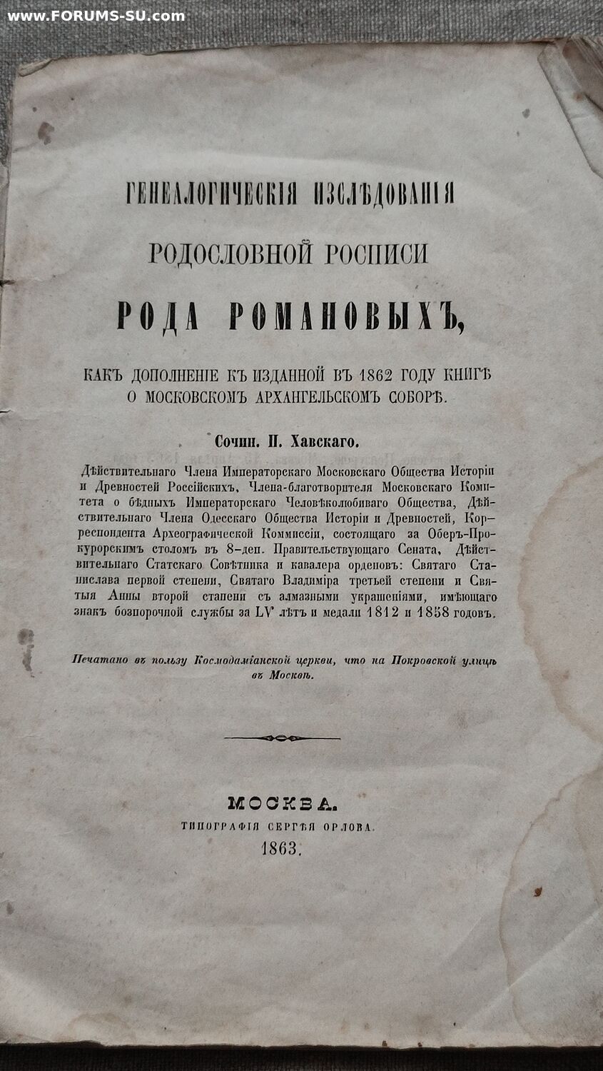 Хавский, П.В. Генеалогические исследования родословной росписи рода Романовых, как дополнение к изданной в 1862 году книге о Московском Архангельском соборе.