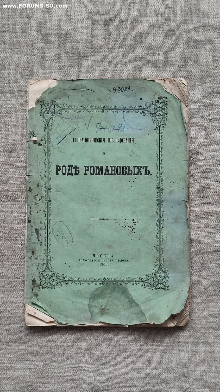 Хавский, П.В. [автограф] Генеалогические исследования родословной росписи рода Романовых, как дополнение к изданной в 1862 году книге о Московском Архангельском соборе. Печатано в пользу Космодамианской церкви, что на Покровской улице в Москве. М.: Тип. Сергея Орлова, 1863. VI, 7-56, [2] c., 1 скл. л. родосл. табл. 26×17 см. В издательской обложке. Надрывы и утраты на корешке, надрывы на обложке, утрата нижнего уголка передней обложки и авантитула, блок чистый. На с. 2 обложки дарственная надпись от автора: «В память праздненств 12 Января 1864 года от Хавского».