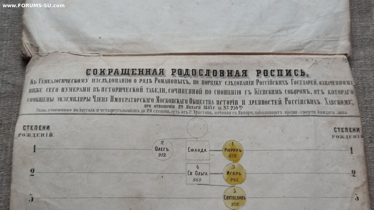 В конец брошюры вплетена складная таблица «Сокращенная родословная роспись, к Генеалогическому исследованию о роде Романовых, по порядку следования российских государей, означенному ниже сего нумерами в исторической табели, сочиненной по сношению с Киевским собором, от которого сообщены экземпляры члену Императорского Московского Общества истории и древностей Российских Хавскому, при отношении 29 января 1857 г. за № 234. Годы, означенные в кругах и четырехугольниках до 29 степени, суть от Р. Христова, начиная с января, показывают время смерти каждого лица». Между прочим, свою таблицу Хавский начинает Рюриком. Анализируя известные исторические источники и историографию, автор дополняет и развивает исследования об Архангельском соборе — усыпальнице московских великих князей, царей и российских императоров. Издание редкое.