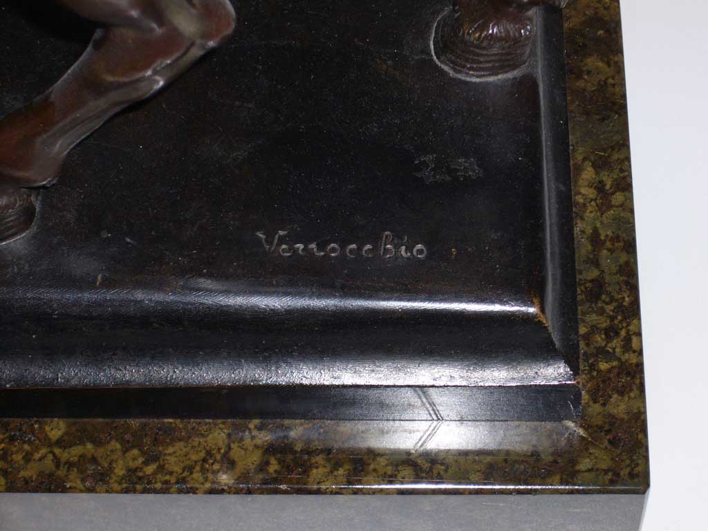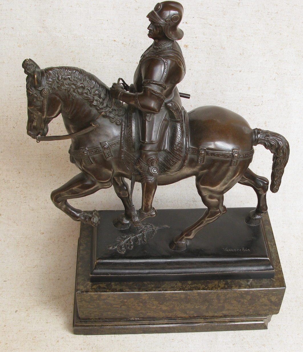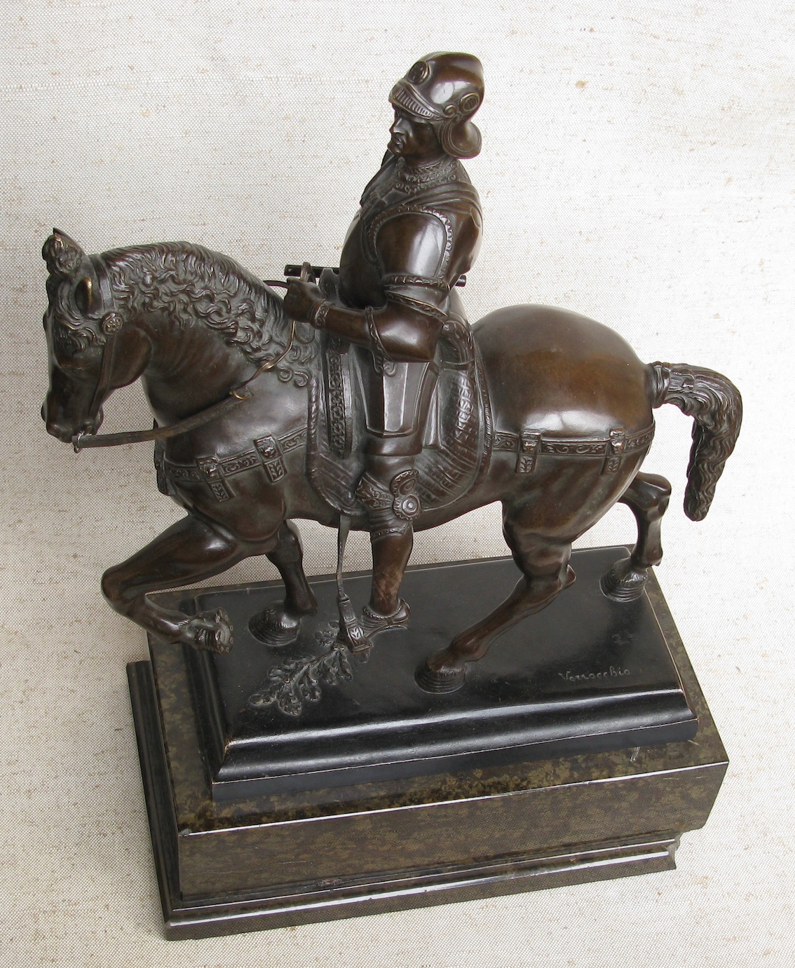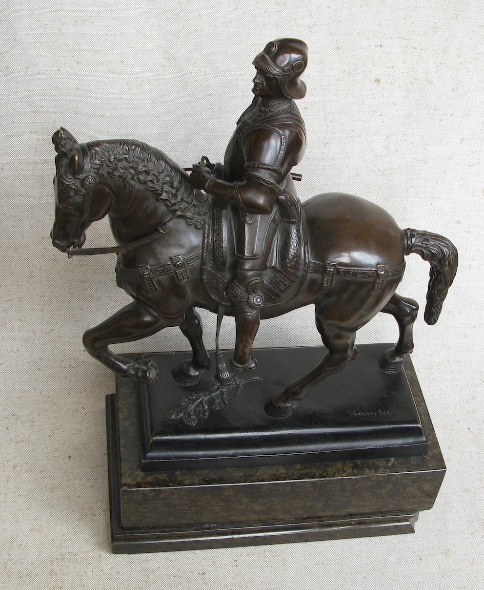 Статуэтка, бронза, патинирование, высота 510 мм с подставкой, уменьшенная копия памятника Кондотьера Коллеоне работы Веррокио (учителя Леонардо Да Винчи), установленного в Венеции. Италия, Рим 1900 г.