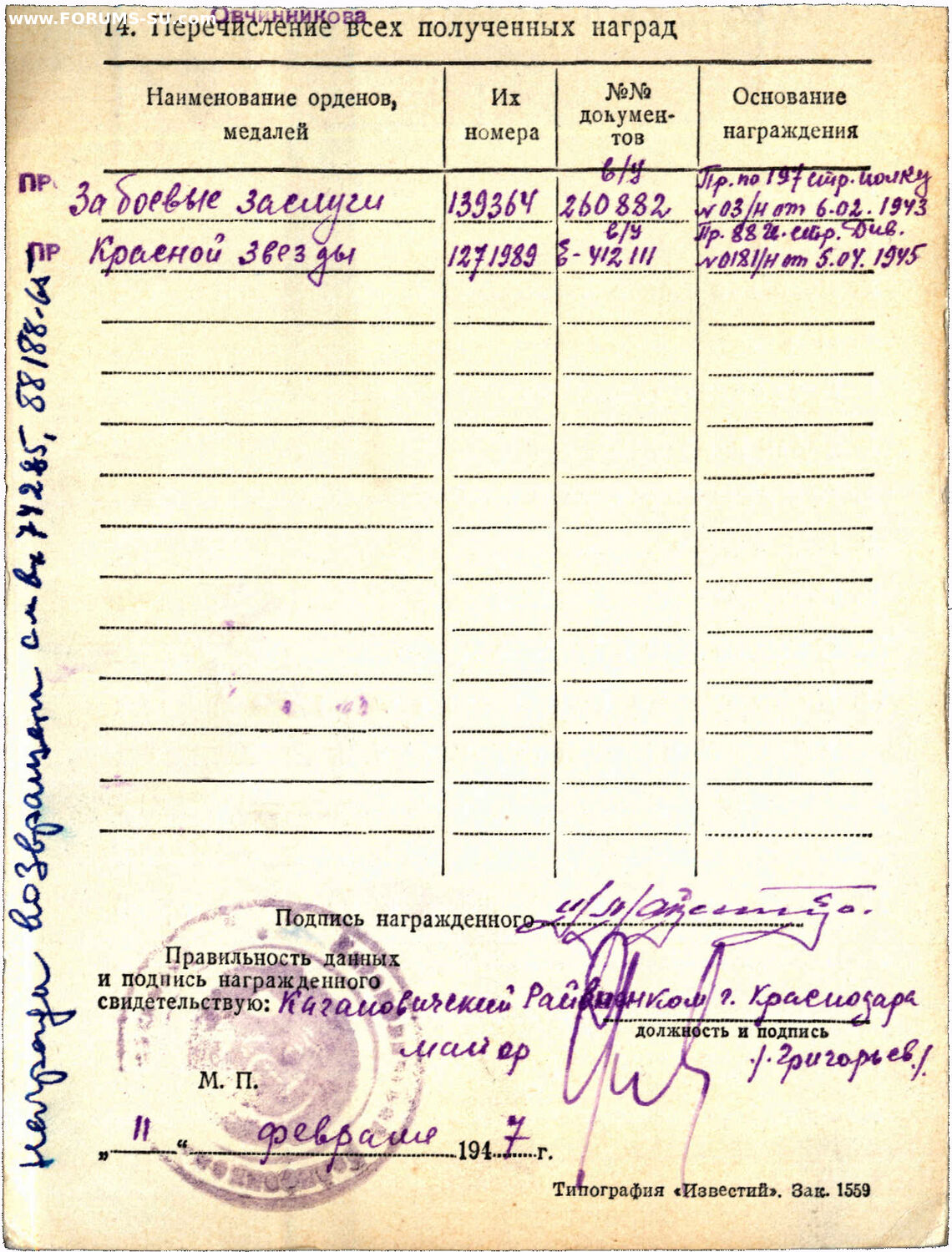 Учётная карточка - копия в цифровом виде. В ней есть отметка что в 1965 году награды возвращены.