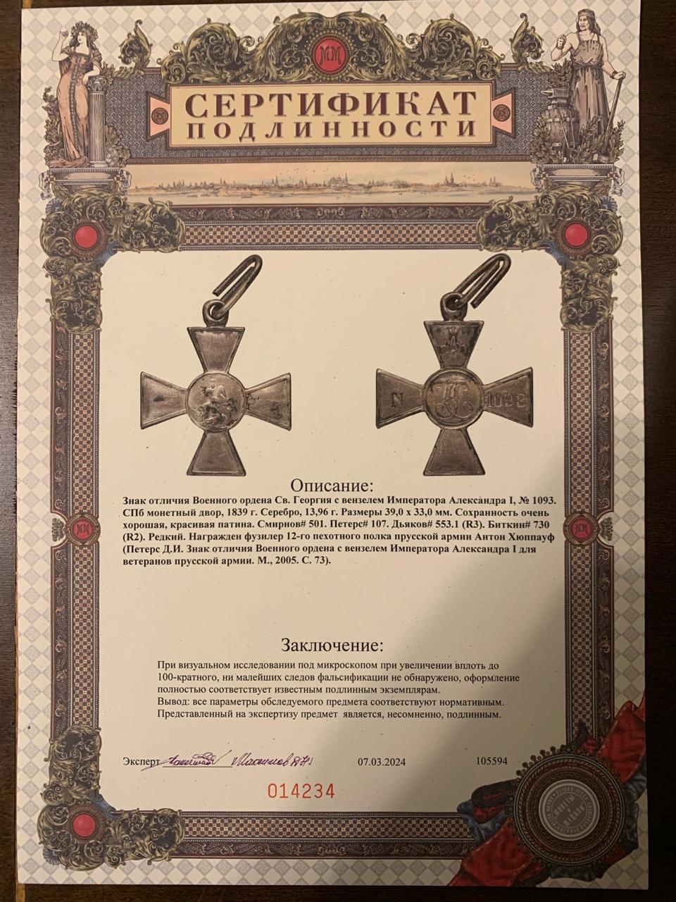 Награжден фузилер 12-го пехотного полка прусской армии Антон Хюппауф (Петерс Д.И. Знак отличия Военного ордена с вензелем Императора Александра I для ветеранов прусской армии. М., 2005. С. 73).