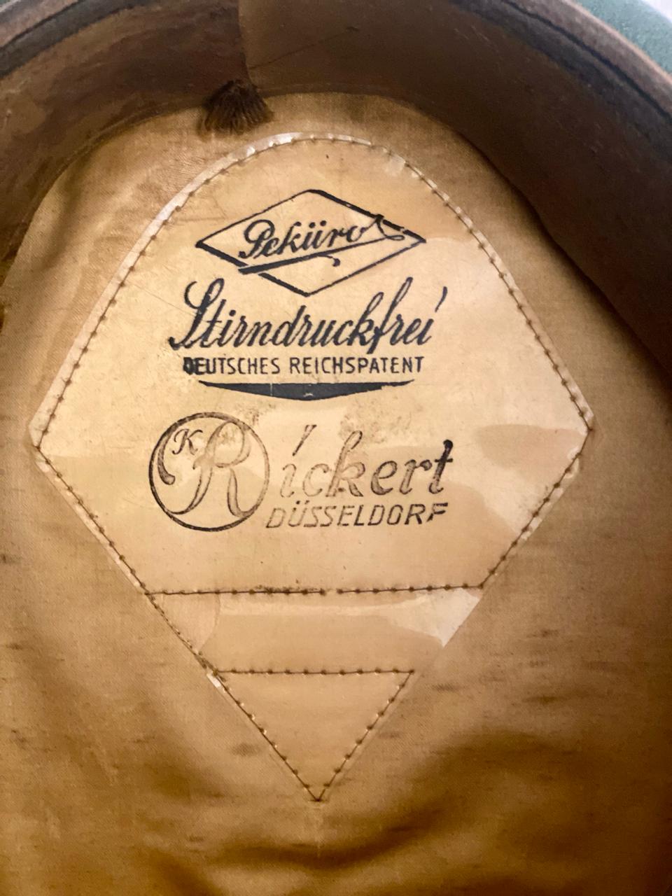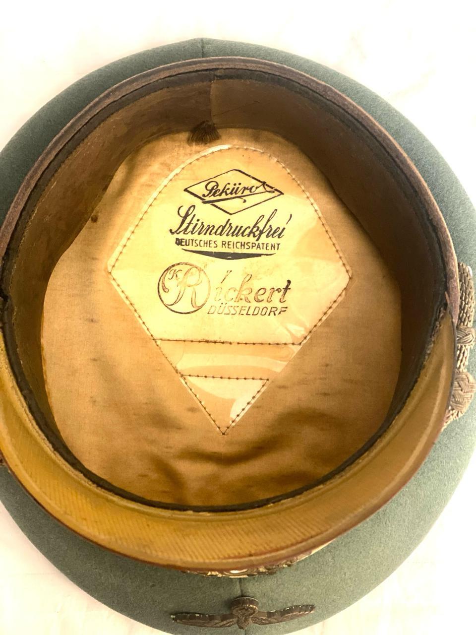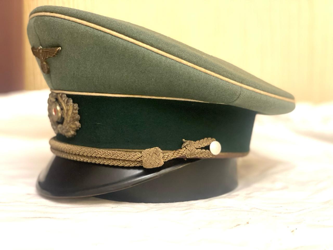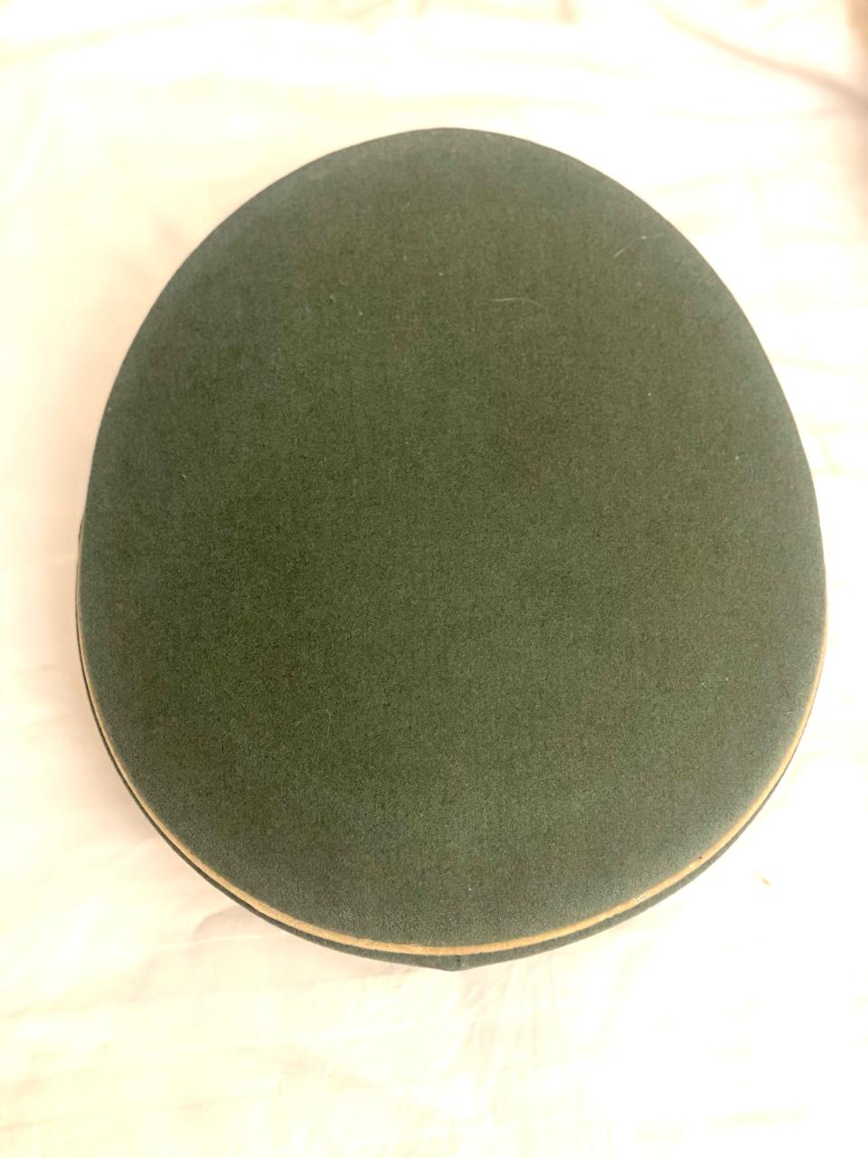 Покупалась в Германии, из семьи много лет назад, принадлежала полковнику. Внутри до сих пор стоит стальной обруч, по моде тех лет форма не ломалась. Размер 59, целлулоид на месте, все по роднеесть небольшые следы бытования. Лакшери производитель тех лет фирма Pekuro .Очень красивая фуражка, достойный предмет в коллекцию