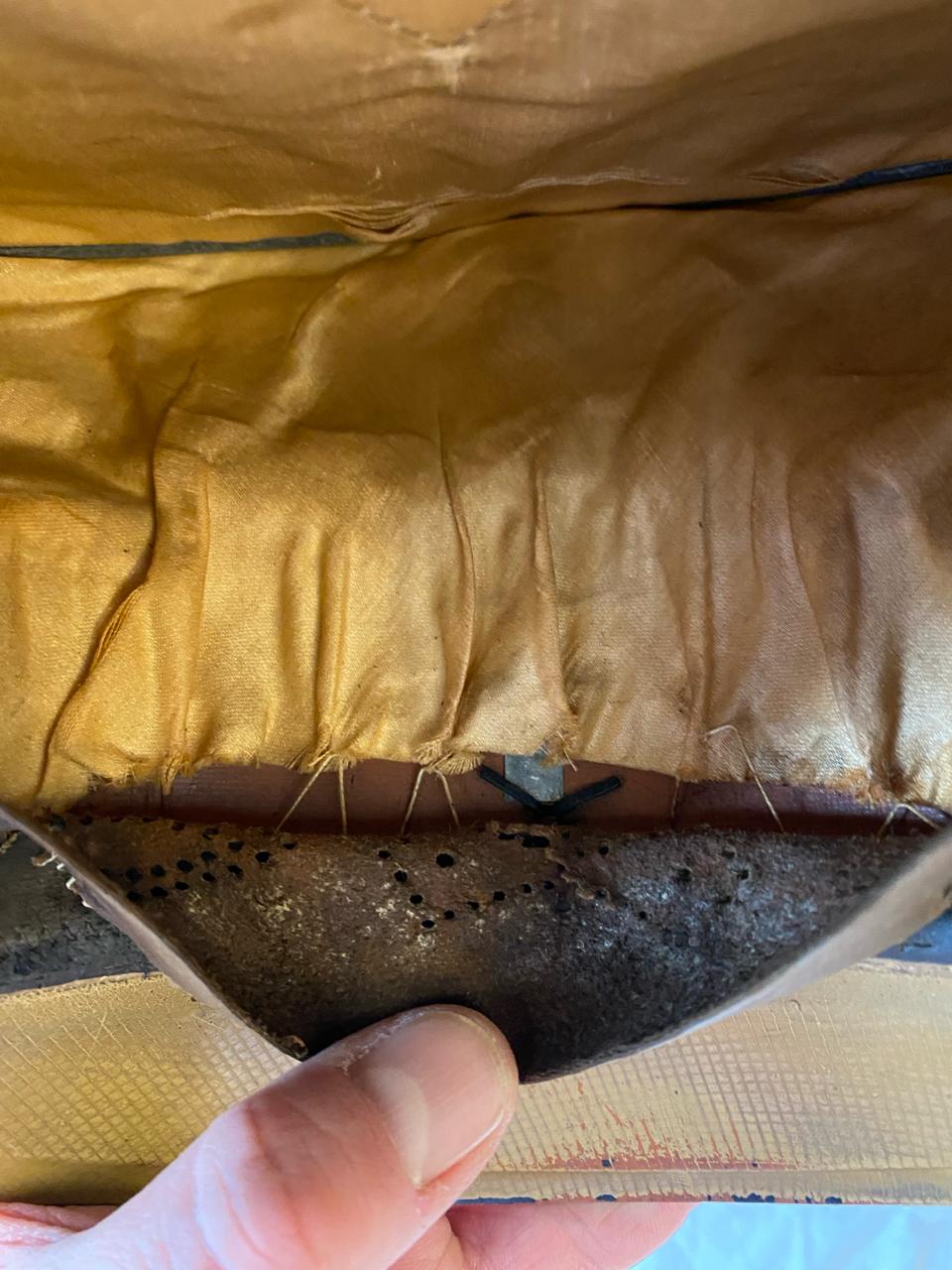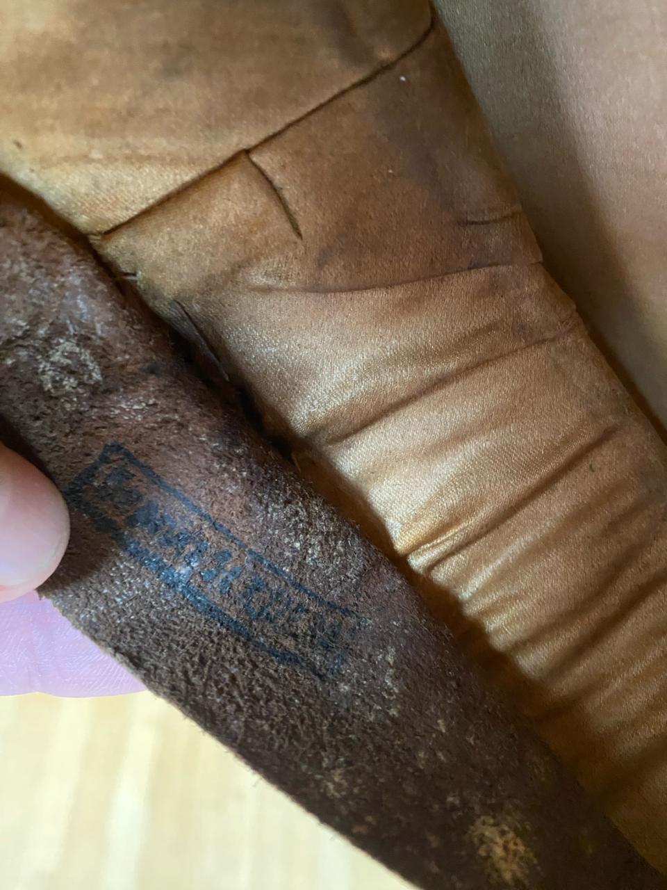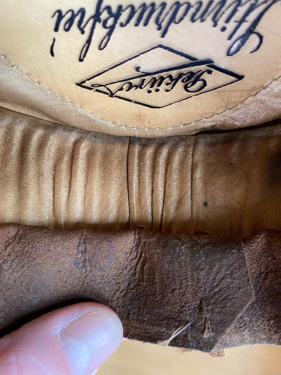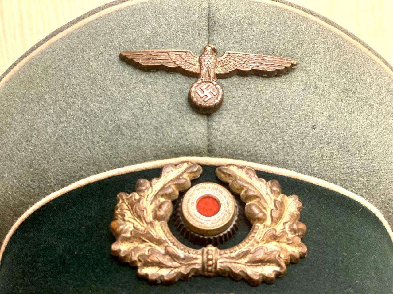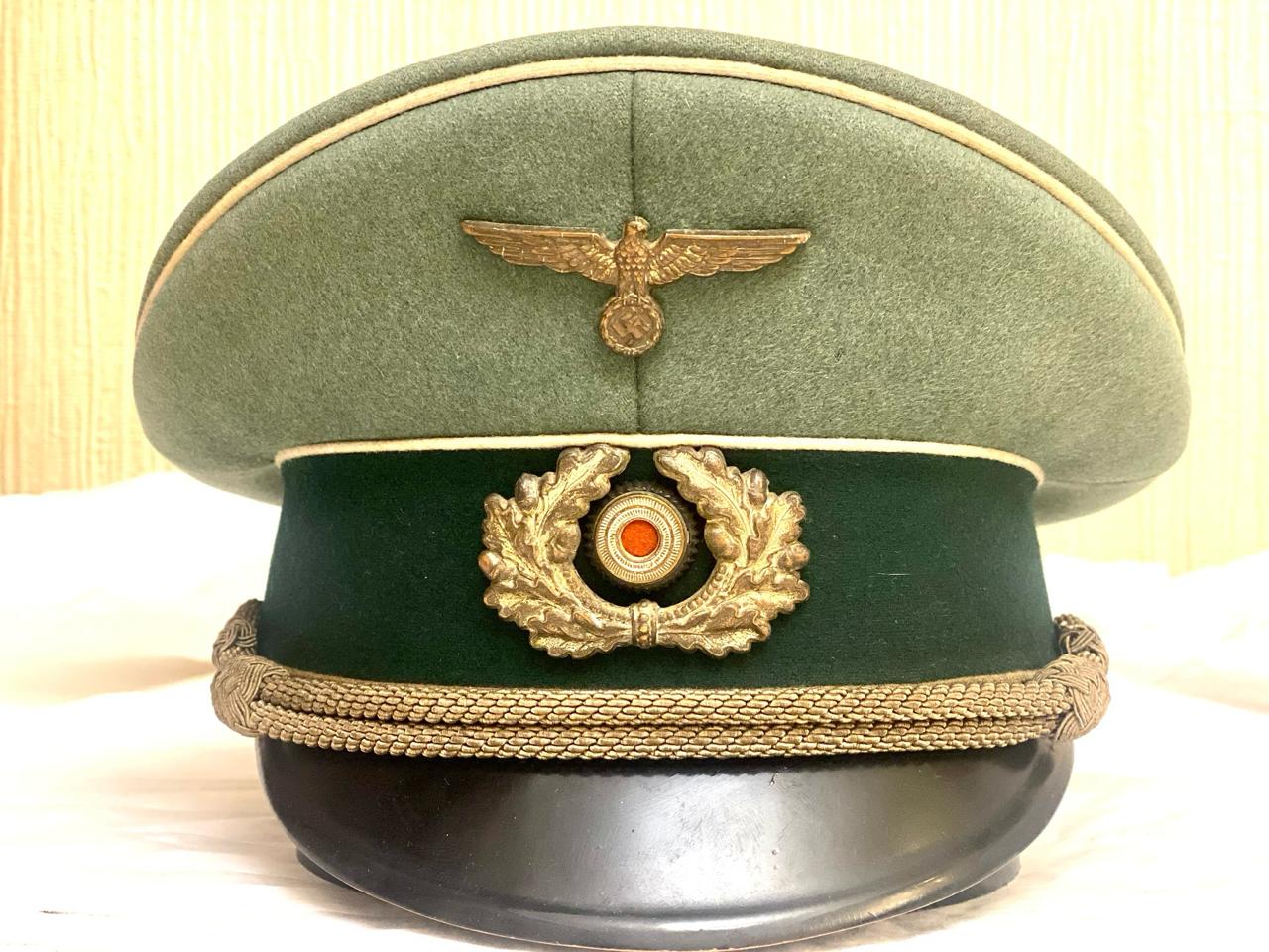 Покупалась в Германии, из семьи много лет назад, принадлежала полковнику. Внутри до сих пор стоит стальной обруч, по моде тех лет форма не ломалась. Размер 59, целлулоид на месте, все по роднеесть небольшые следы бытования. Лакшери производитель тех лет фирма Pekuro .Очень красивая фуражка, достойный предмет в коллекцию