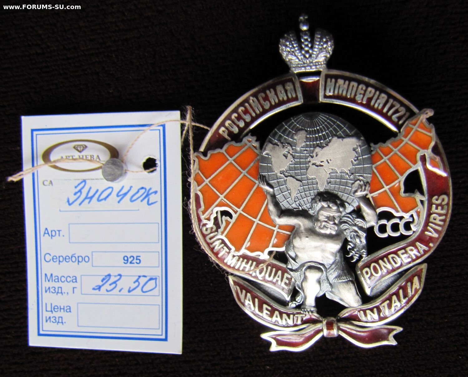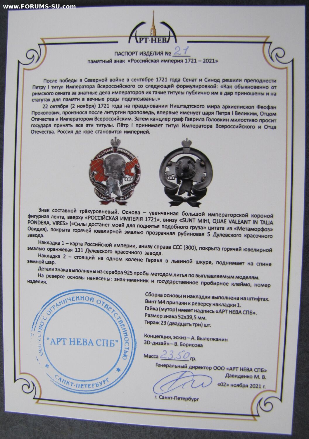 Коллекционный памятный знак "Российская империя 300" № 21. Серебро 925, горячие эмали, тираж 23 шт.