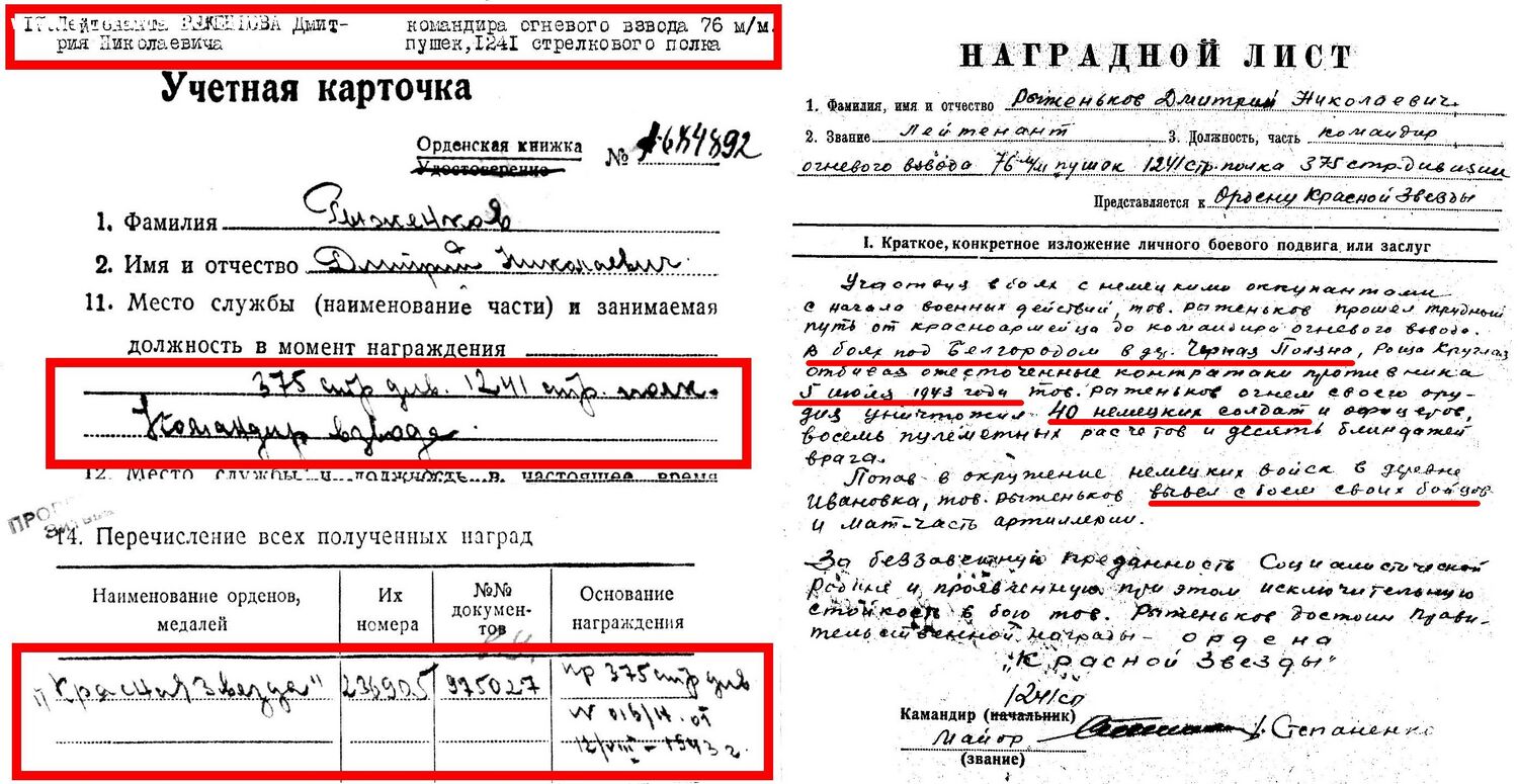 Личный Подвиг : в ПЕРВЫЙ ДЕНЬ КУРСКОЙ БИТВЫ 5 июля 1943 - В боях под БЕЛГОРОДОМ в деревне ЧЕРНАЯ ПОЛЯНА, РОЩА КРУГЛАЯ - ОТБИВАЯ ОЖЕСТОЧЕННЫЕ КОНТРАТАКИ ВРАГА ОГНЁМ СВОЕГО ОРУДИЯ - УНИЧТОЖИЛ - 40 ФРИЦЕВ, 8 ПУЛЕМЁТНЫХ РАСЧЕТОВ, 10 БЛИНДАЖЕЙ ВРАГА.