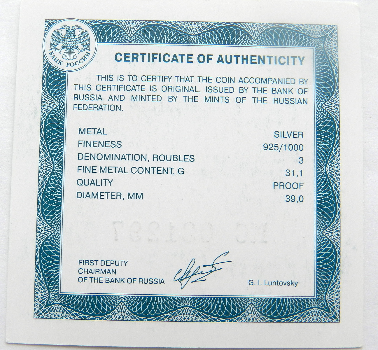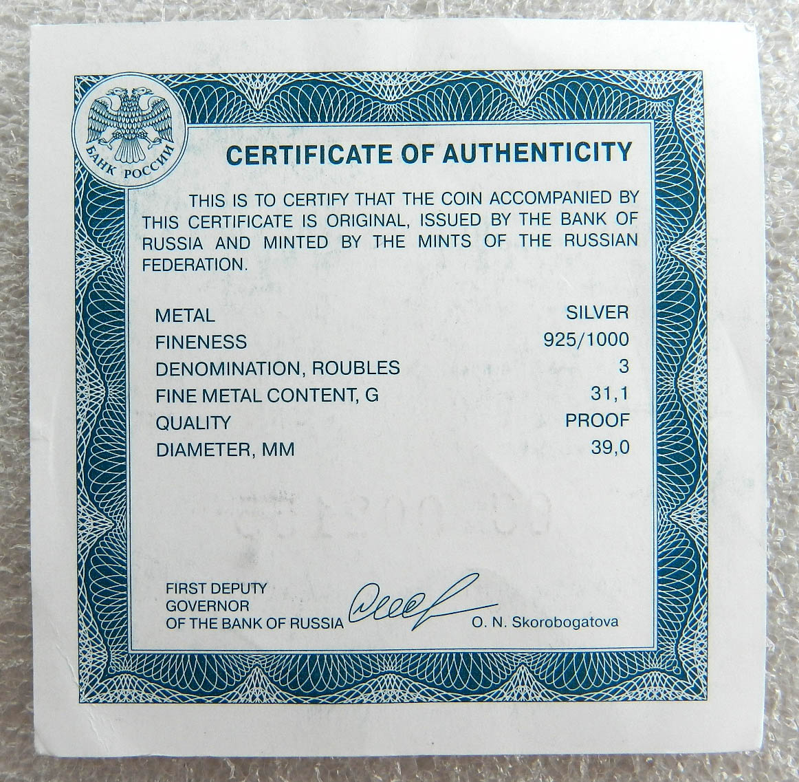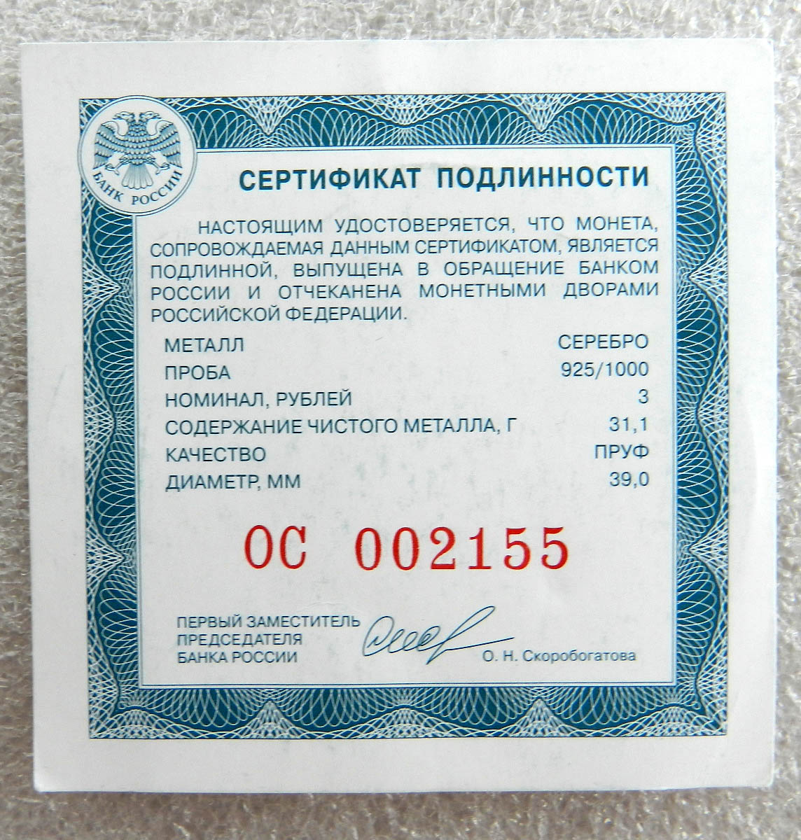 Оригинальный сертификат на серебрянные 3 рубля Gatherer - 21 дек 2024 19:15.10 × Мини профиль пользователя Gatherer Сообщения: 3073 Зарегистрирован: 21 фев 2013 13:23.38 Статус: Не в сети - 21 дек 2024 19:15.10 #6767837 Оригинальный сертификат на серебрянные 3 рубля (Скоробогатова)Цена 300 с почтой. Фото