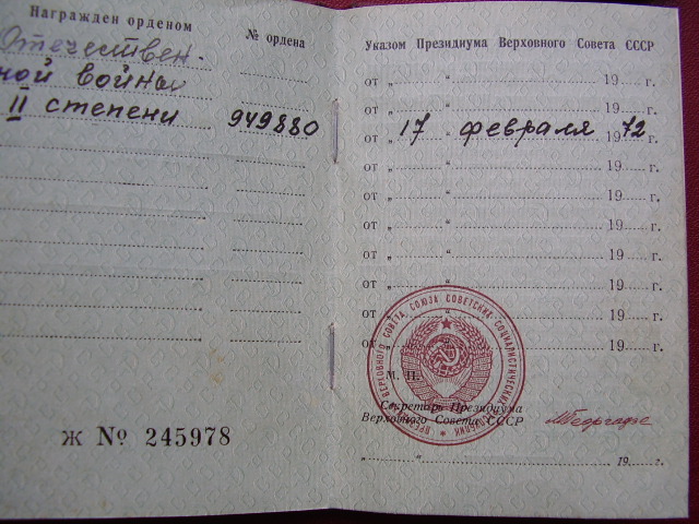 Красного Знамени, Суворова, Кутузова, Богдана Хмельницкого, Александра Невского, Ушакова, Нахимова, Отечественной Войны, Красной Звезды, Славы, За Службу Родине в ВС СССР