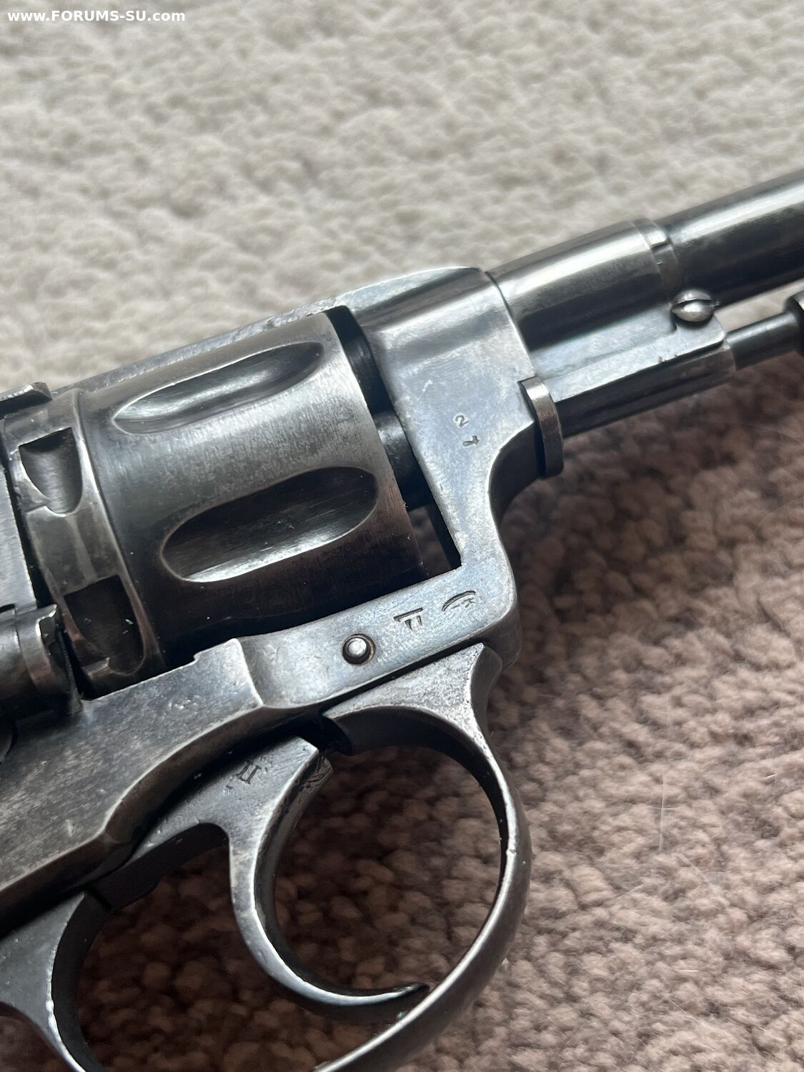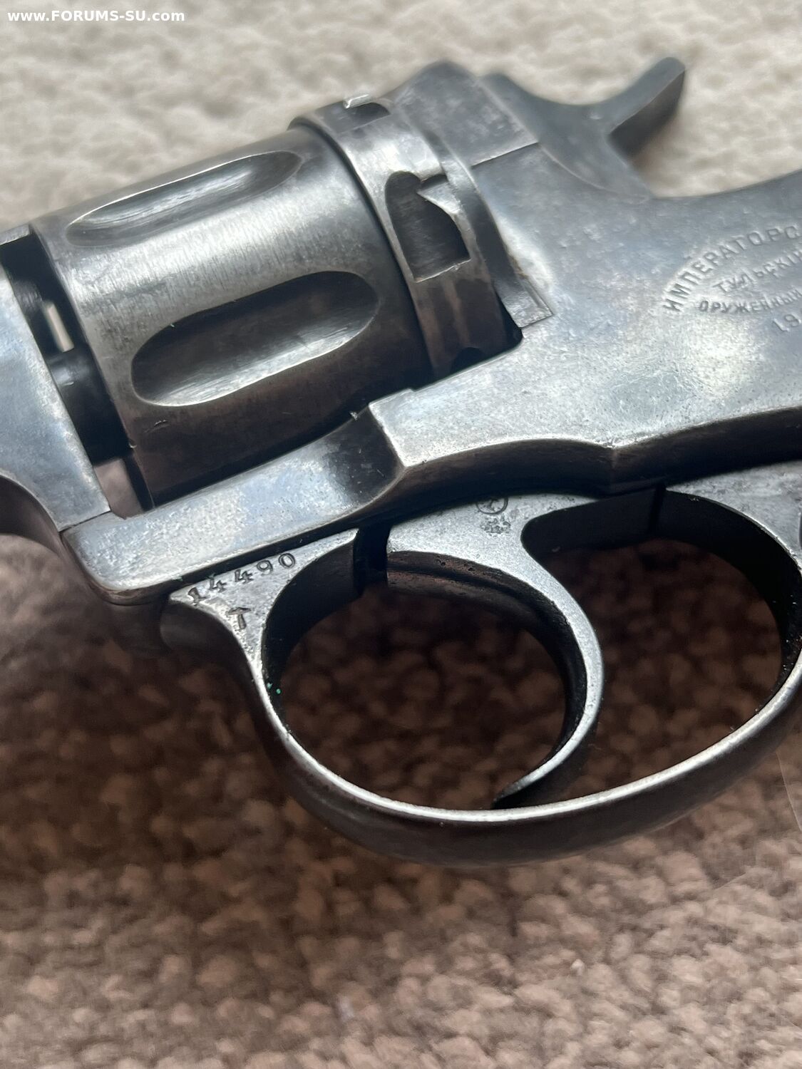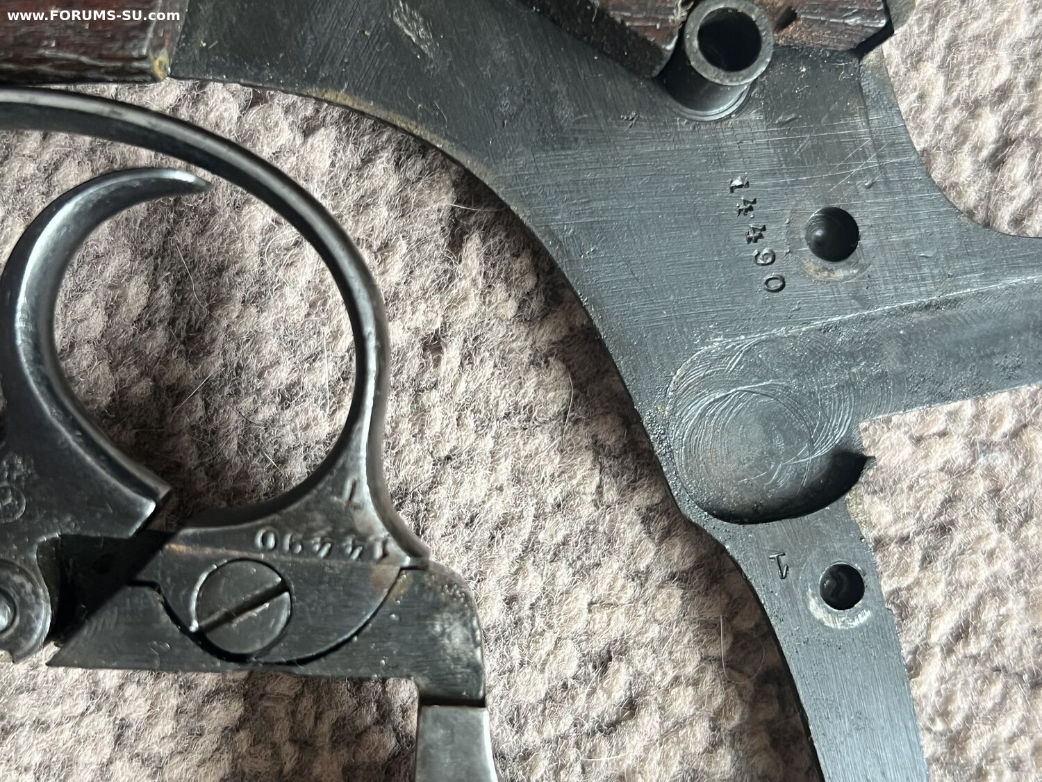 Родной номер на крышке, и на скобе. На барабане нет, так как при переделке барабанов идиоты из байкала тупо кидали их в кучу а потом ставили на рандомный наган.