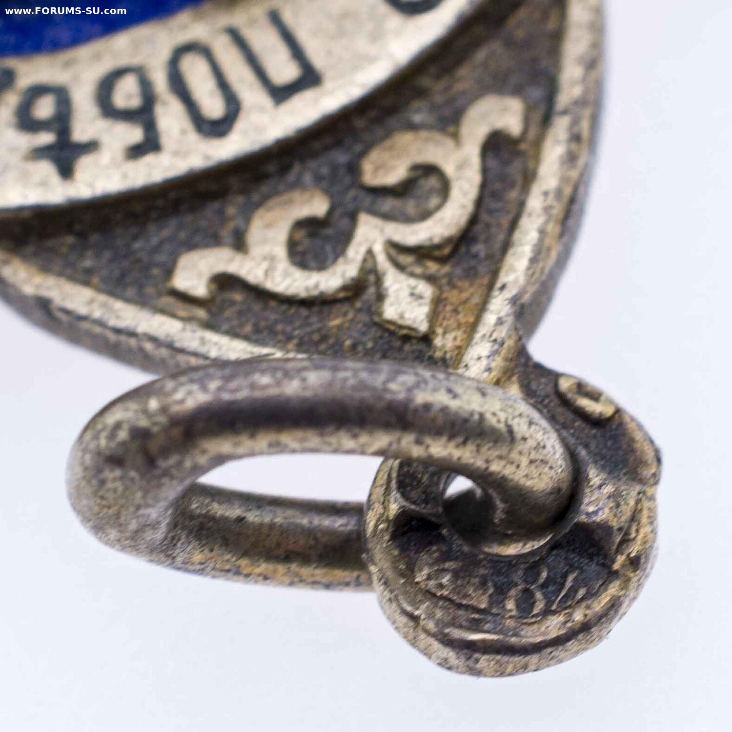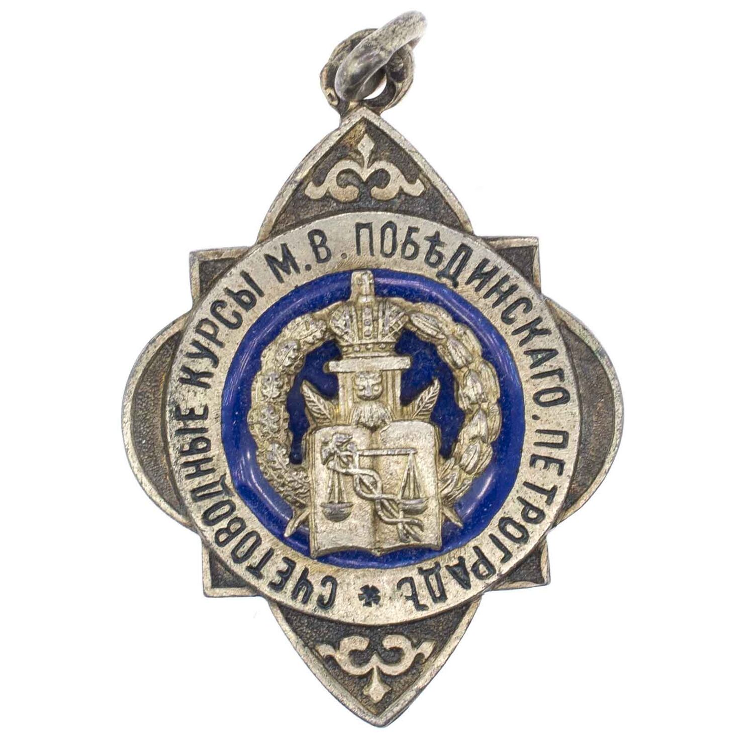 Клеймо на ушке с лицевой стороны жетона: СПб окружного пробирного управления в овальном [альфа, женская головка в кокошнике, вправо, 84]. Серебро, позолота, эмаль, 11.3 гр. Размеры 36.5 × 26.1 мм.