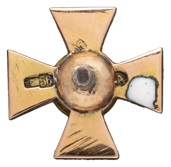 Петроград, 1914–1917 гг. Фирма «Эдуард». Клейма на об. ст. знака ордена: Петроградского окружного пробирного управления в щитке в форме лопатки [альфа, женская головка в кокошнике, вправо, 56] и именное клеймо «ВД». Золото, эмаль, серебро, 4,99 г. Размеры 16,6 х 17,0 мм.