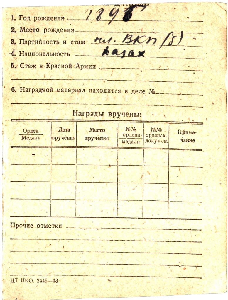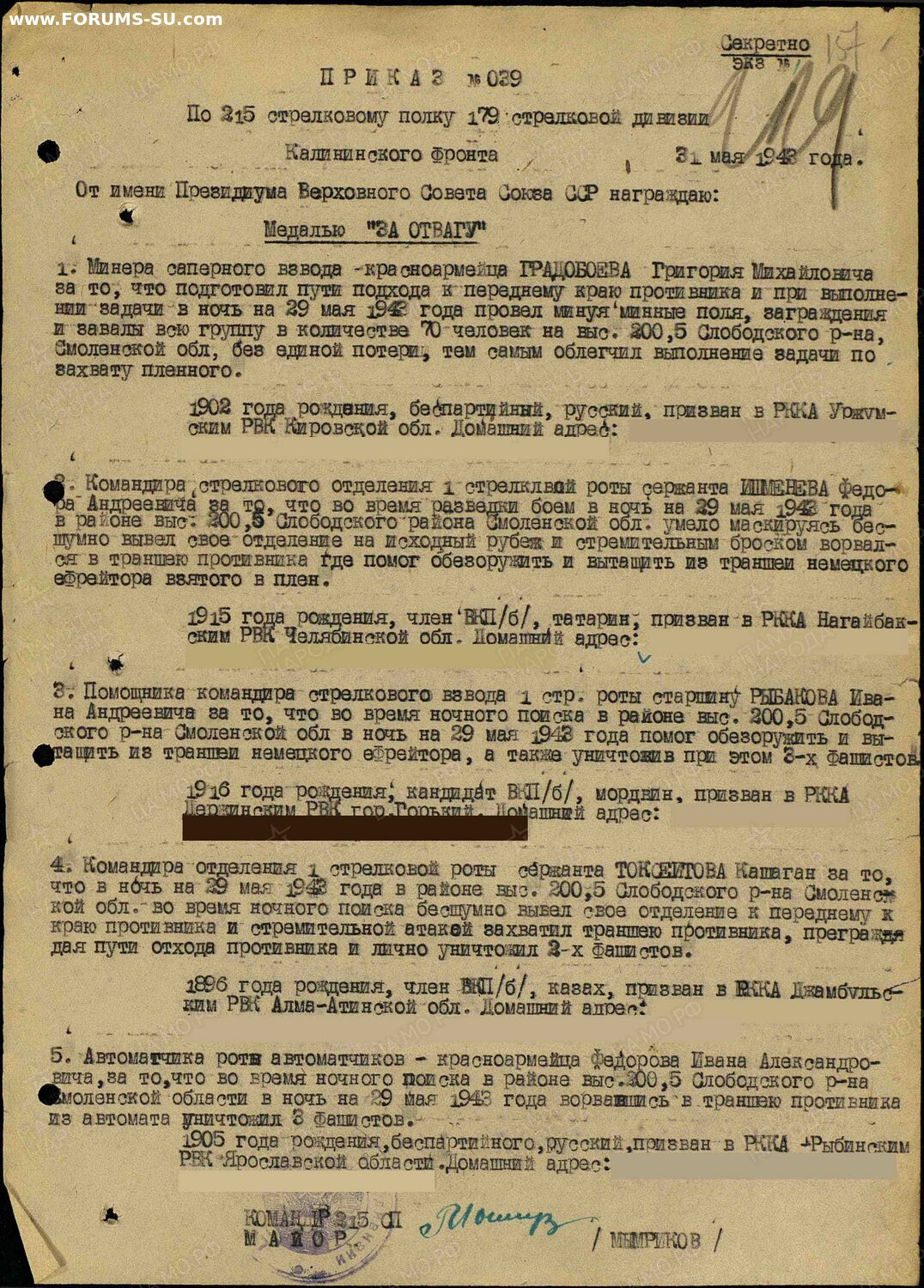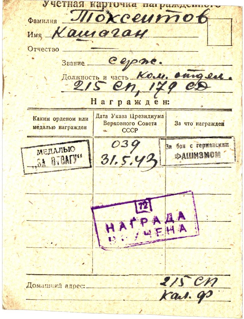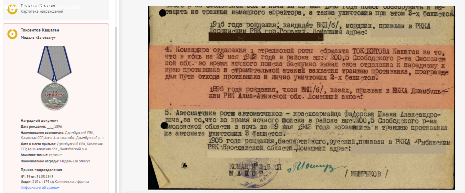 НЛ на ком. отделения, сержанта, 215 СП 179 СД. Ночная разведка -бесшумно вывел свое отделение до позиций противника, и стремительно захватил траншеи врага,лично уничтожил 2 ух немцев,отрезал пути отхода противнику. Смоленская область, Слободский район, высота 200,5