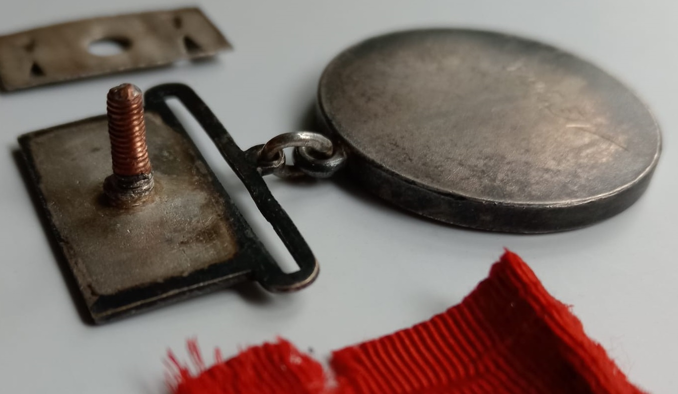 Всё постарался показать на фото. Всё оригинальное. Гайки нет, у ,,крокодила,, один зацеп отсутствует, лента ветхая,скорее идёт бонусом. Кавалер пропал без вести осенью 1941 года.
