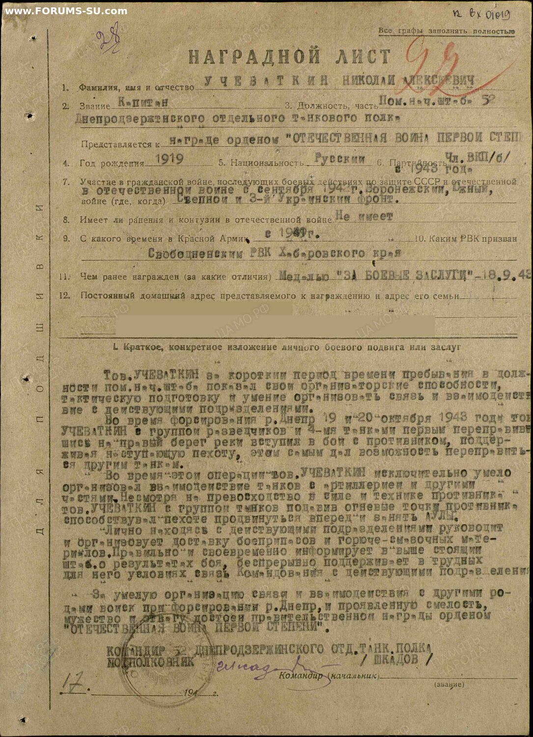 Кавалер-Учеваткин Николай Алексеевич,награда за форсирование Днепра.Н/Л есть на Подвиге,учётка в эл.виде.