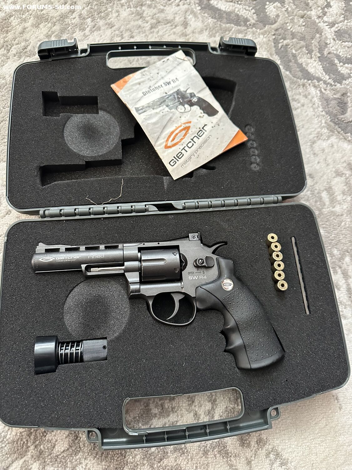Пневматический револьвер Gletcher SW R4. Он характеризуется надежным механизмом, высоким качеством материалов и сборки, а также прекрасными характеристиками мощности и скорости полета пули. Отличная модель для стрельбы по мишеням с небольшой дистанции!