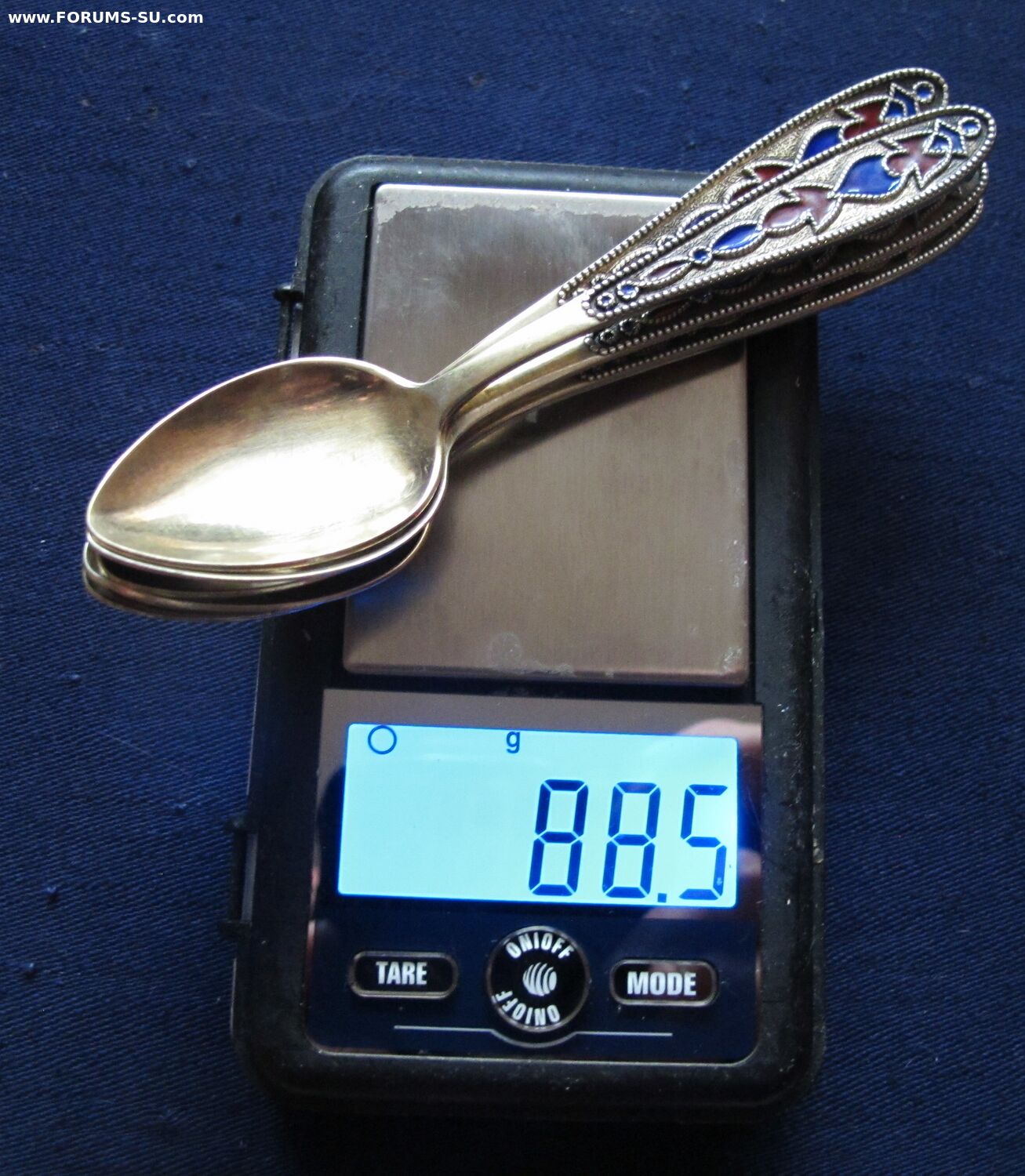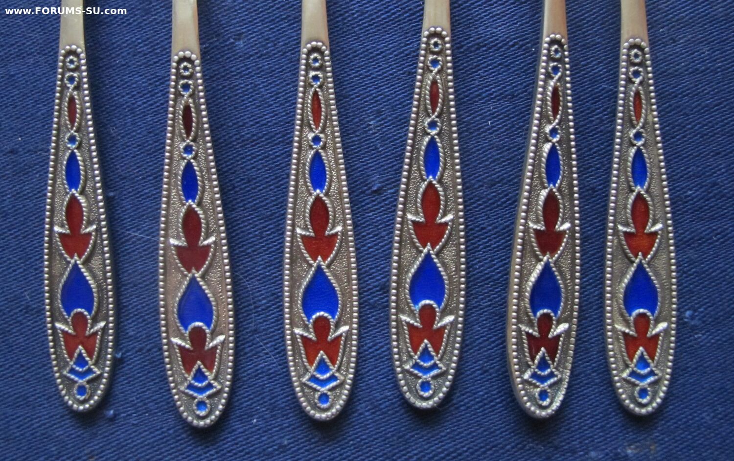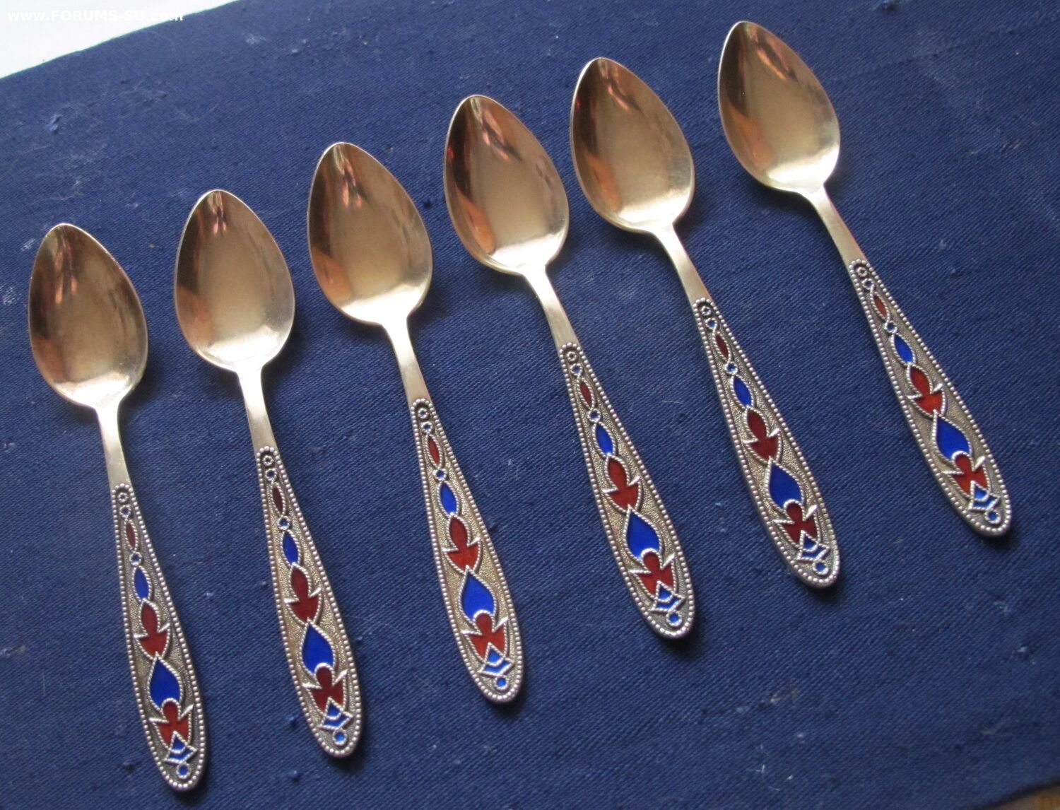 Состояние очень хорошее.Без сколов и чешуек эмали,без запилов,царапок на поверхности ложек.Позолота сохранилась хорошо.Изготовитель -Ленинградский завод "Русские самоцветы",1973г. Длина-11.7 см, вес- 88.5 г.