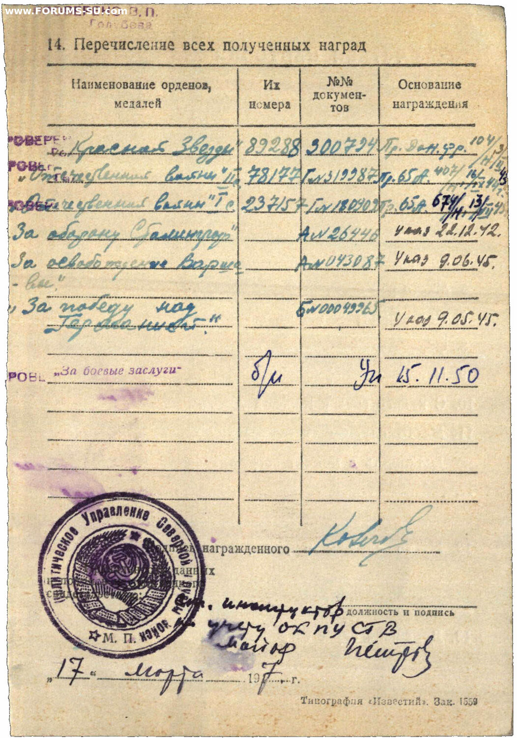 Красного Знамени, Суворова, Кутузова, Богдана Хмельницкого, Александра Невского, Ушакова, Нахимова, Отечественной Войны, Красной Звезды, Славы, За Службу Родине в ВС СССР