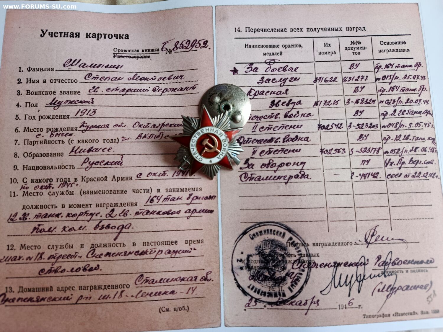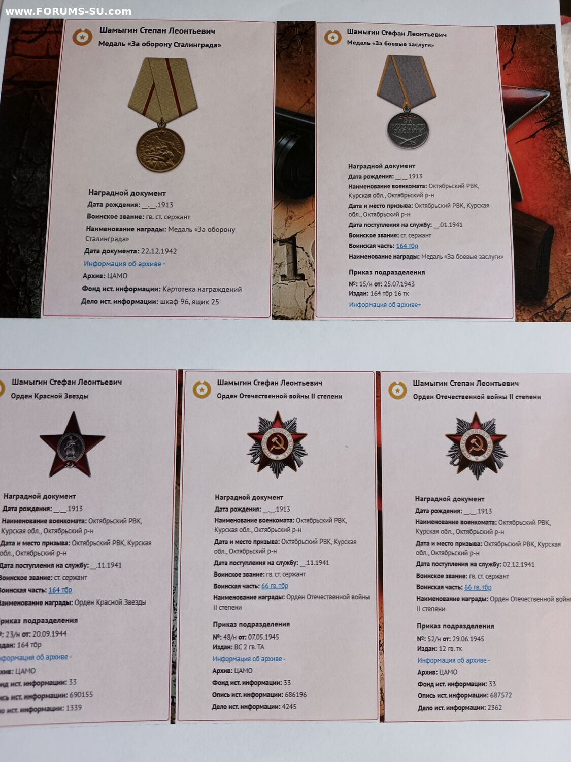 Красного Знамени, Суворова, Кутузова, Богдана Хмельницкого, Александра Невского, Ушакова, Нахимова, Отечественной Войны, Красной Звезды, Славы, За Службу Родине в ВС СССР