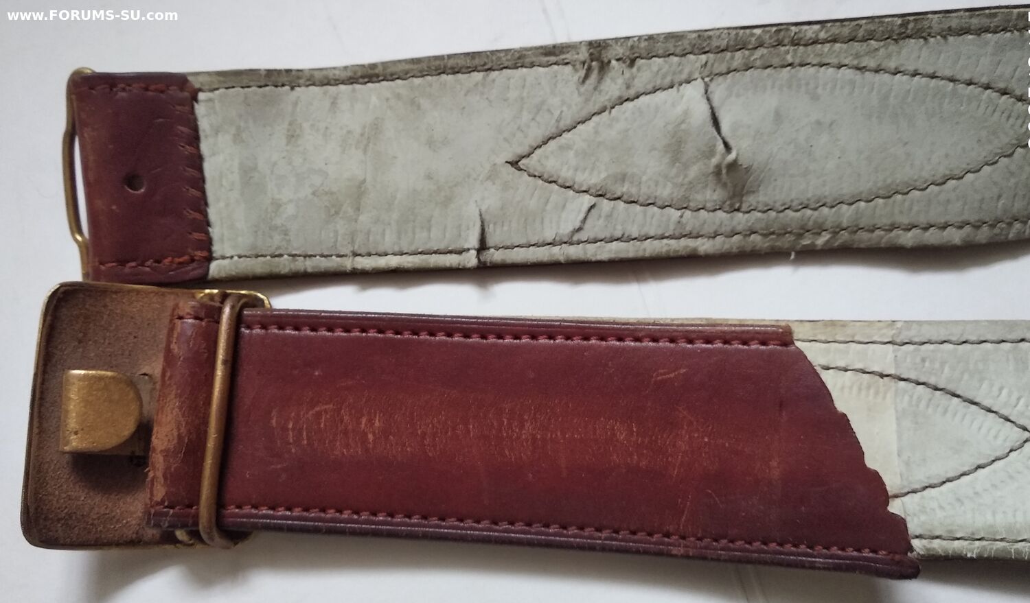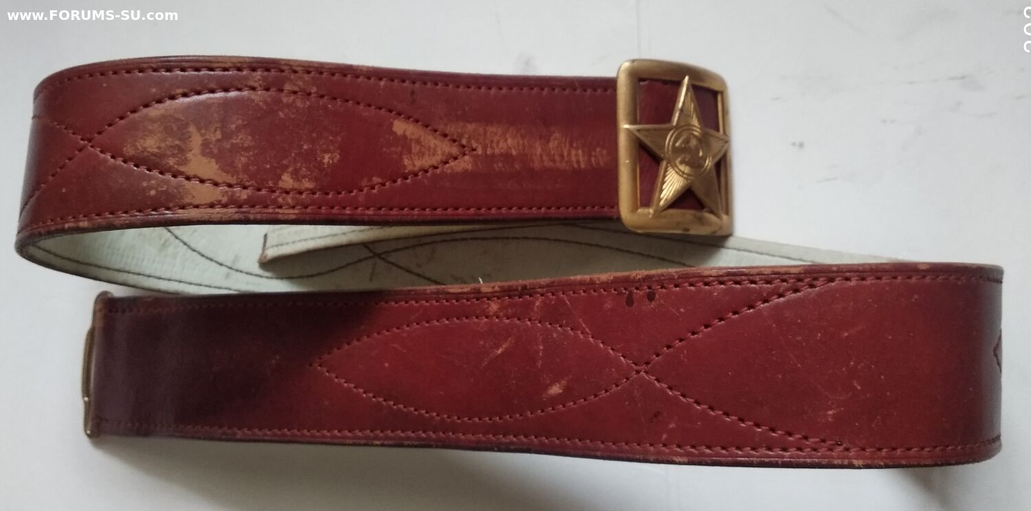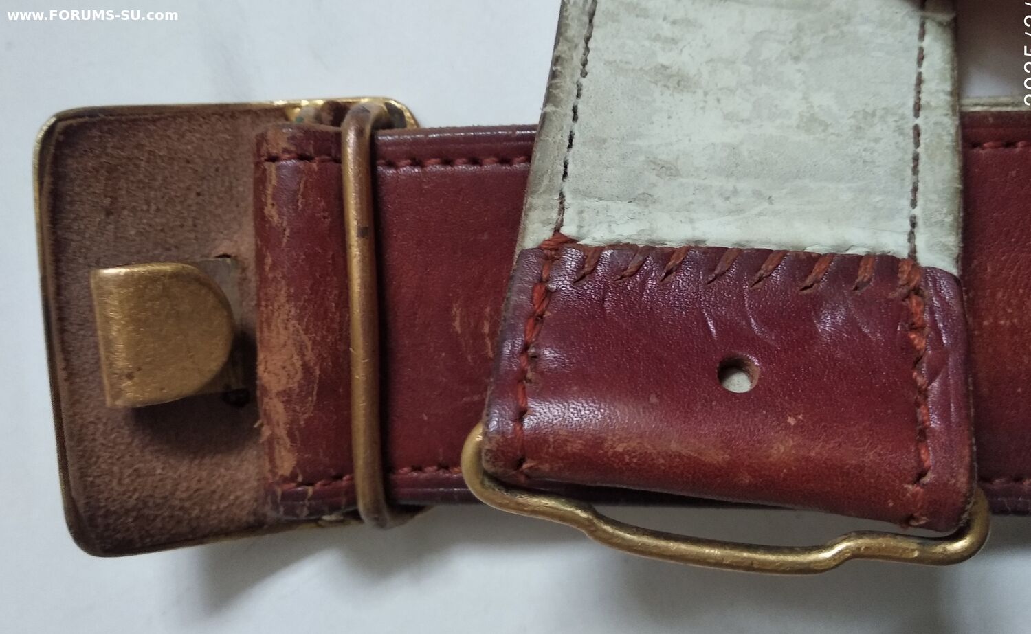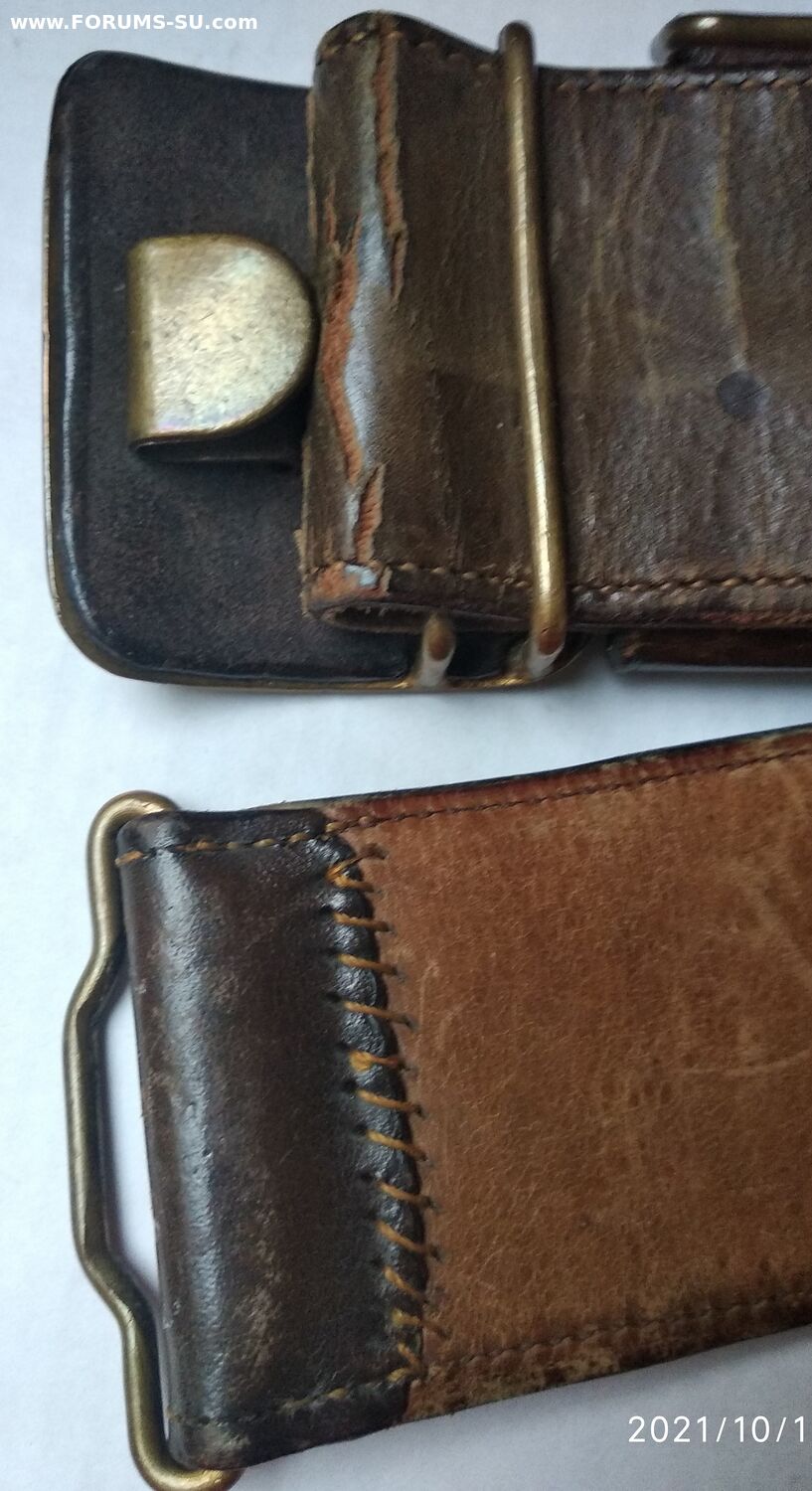 Подлинный безвопросный ремень без рукоделий и перешивов. В хорошем состоянии, мягкий, все по родне, общая длина 110см, ширина полотна 50мм (сшито из двух слоев). Клейм и других обозначений не нашел. Думается на войну, тк подложка нежно бежевого цвета и нет клейм (видел в продаже 54 года- там с клеймом и подложка почти коричневая).