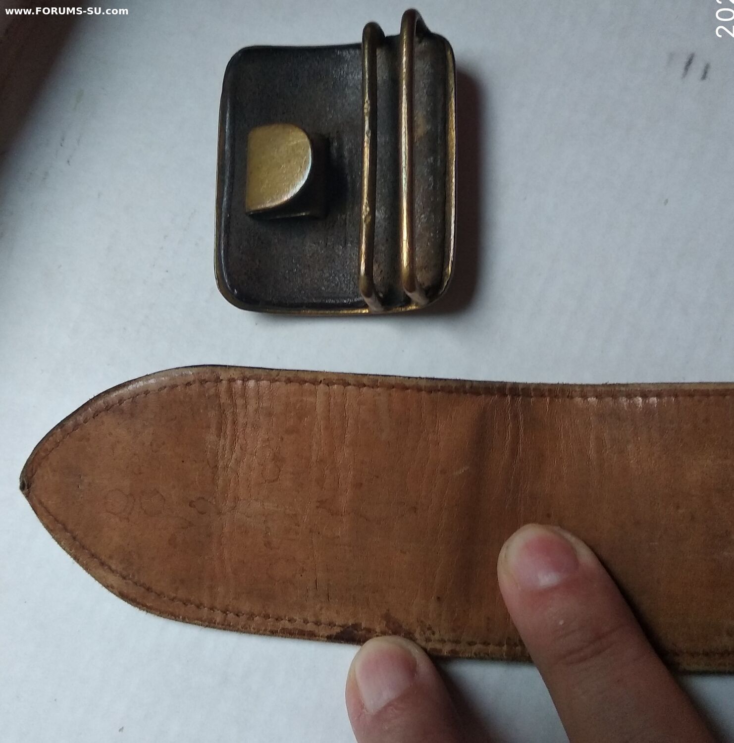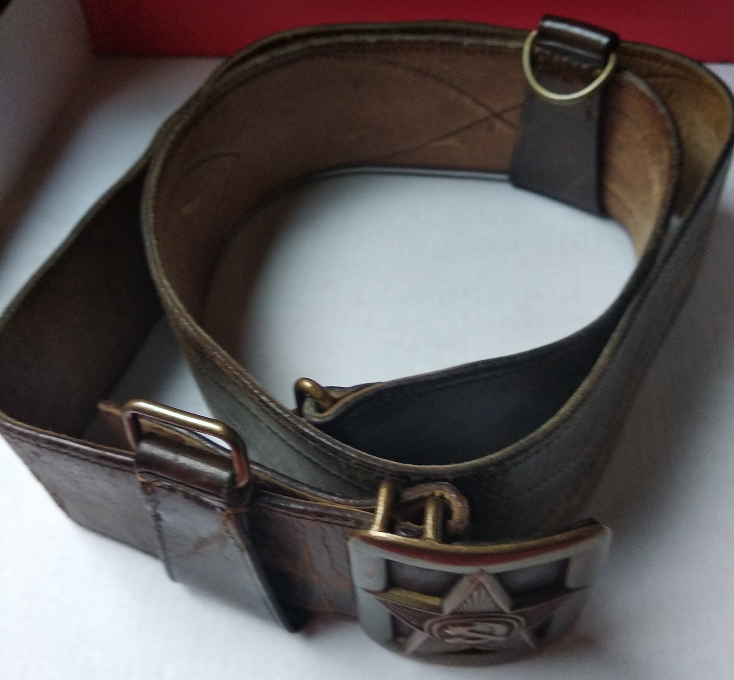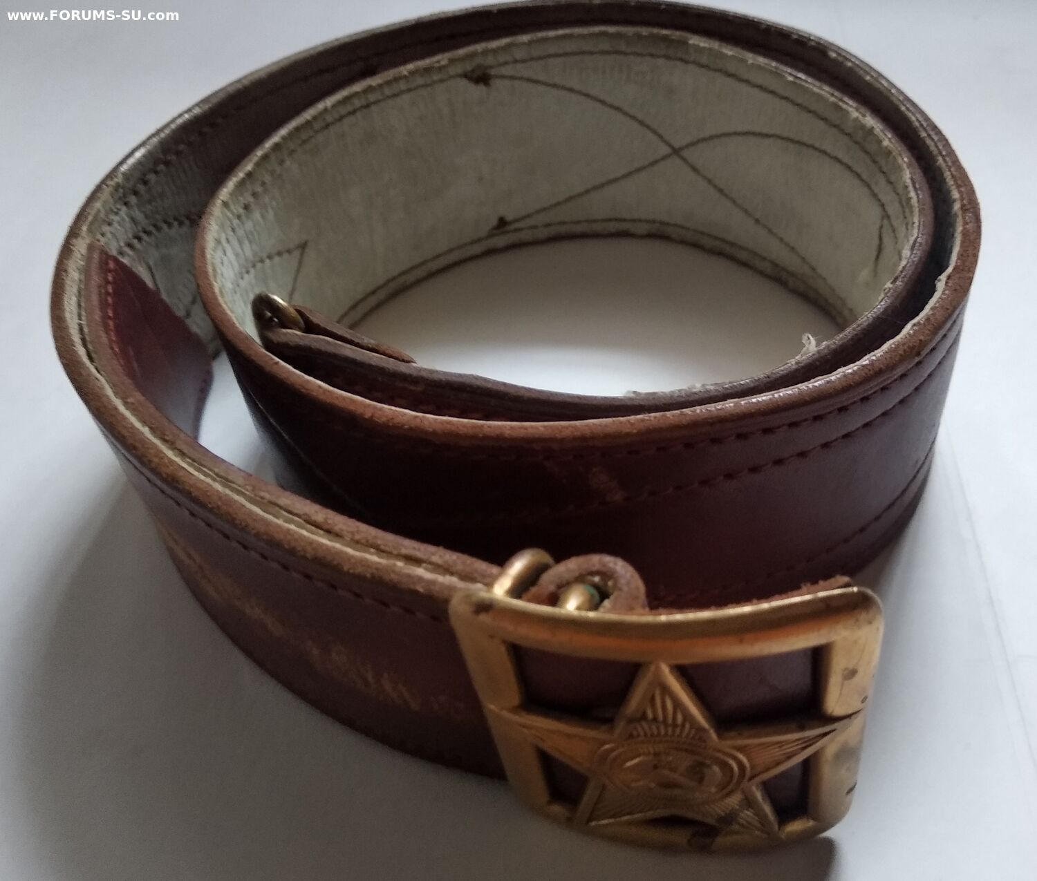 Подлинный безвопросный ремень без рукоделий и перешивов. В хорошем состоянии, мягкий, все по родне, общая длина 110см, ширина полотна 50мм (сшито из двух слоев). Клейм и других обозначений не нашел. Думается на войну, тк подложка нежно бежевого цвета и нет клейм (видел в продаже 54 года- там с клеймом и подложка почти коричневая).